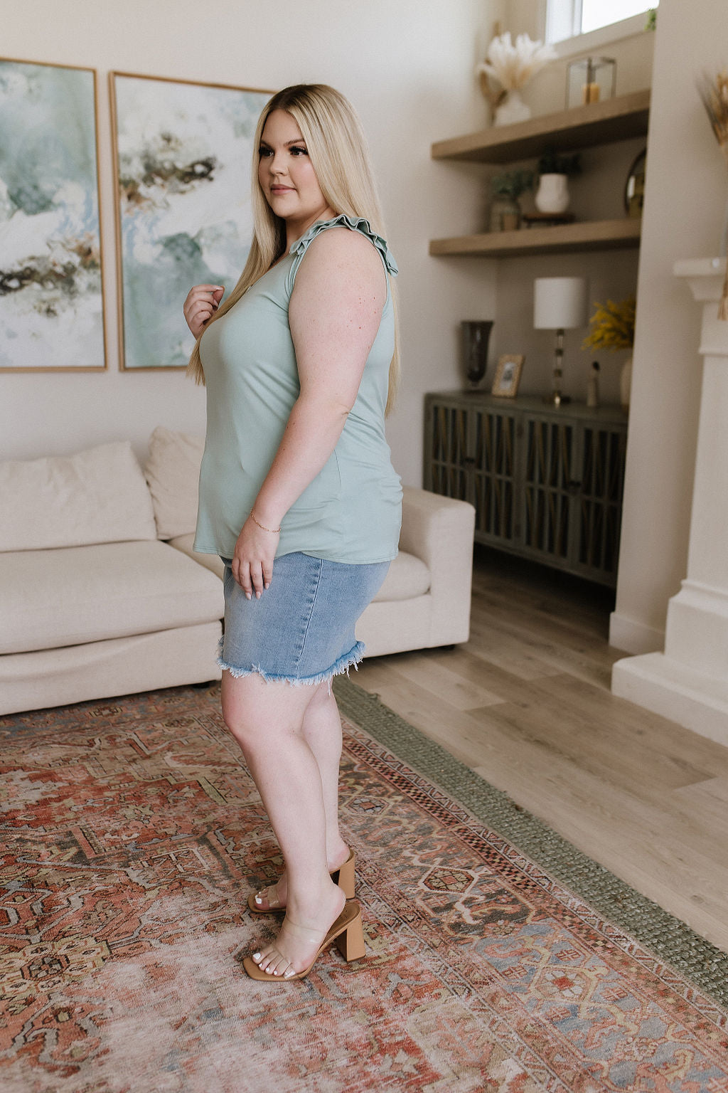 This Good For You Ruffle Detail Tank is the perfect way to add a pop of femininity to your wardrobe. This soft jersey knit tank features a flattering v-neckline and an easy fit. The gathered ruffle detail straps will make you look and feel beautiful all day long!