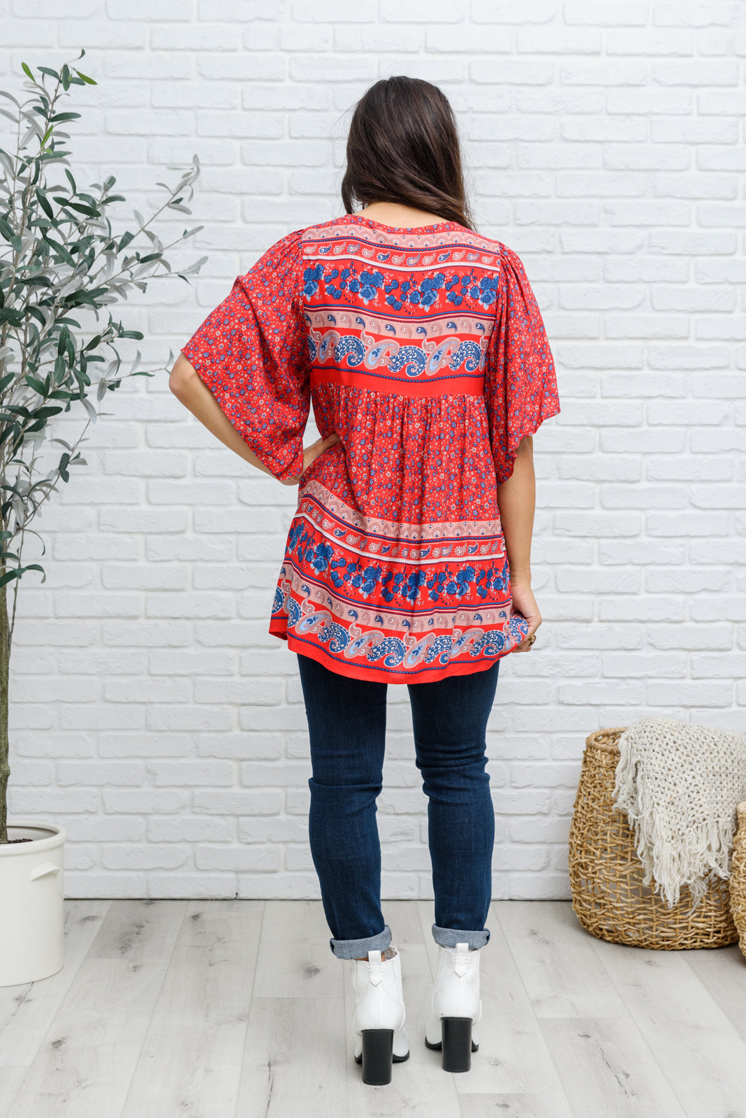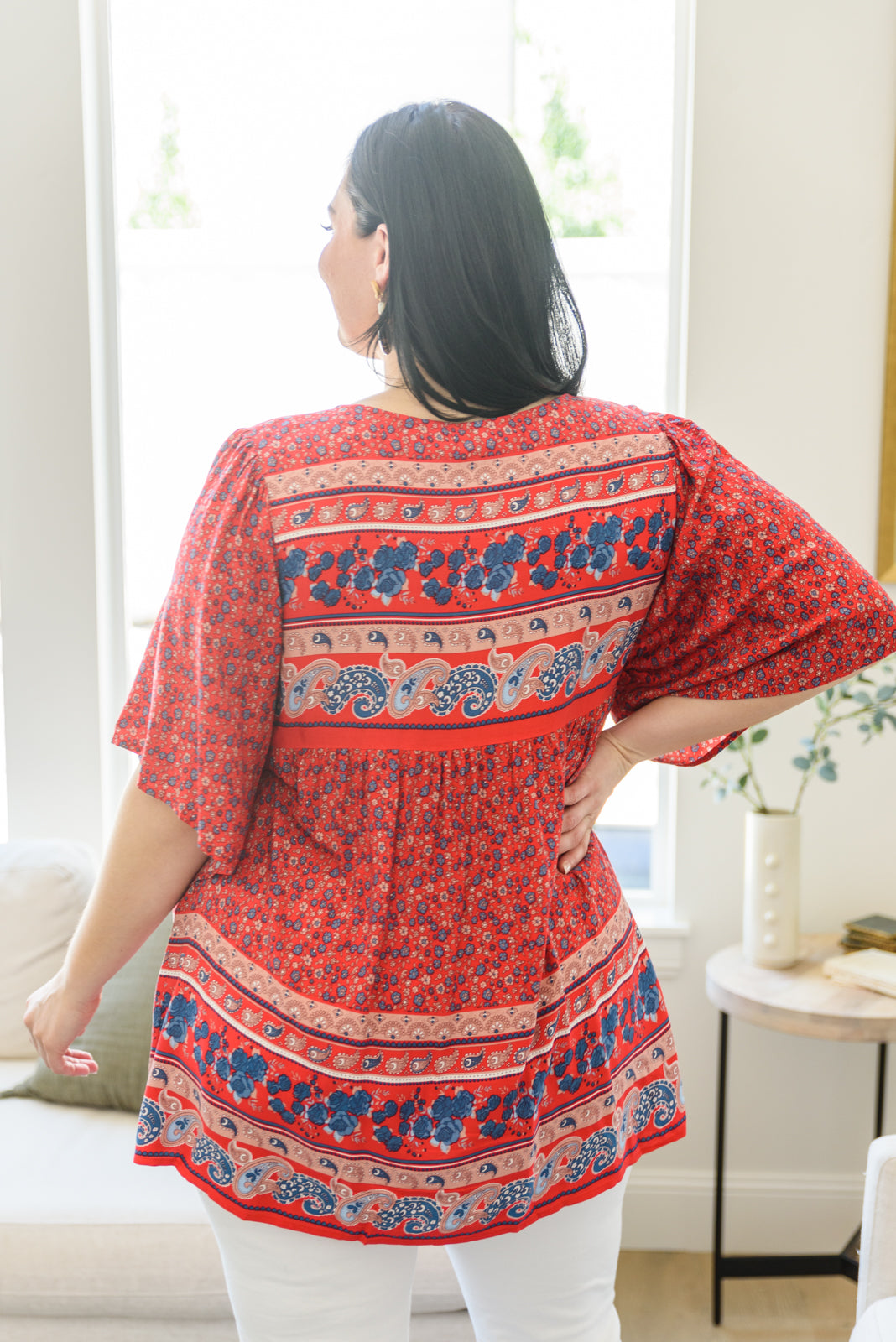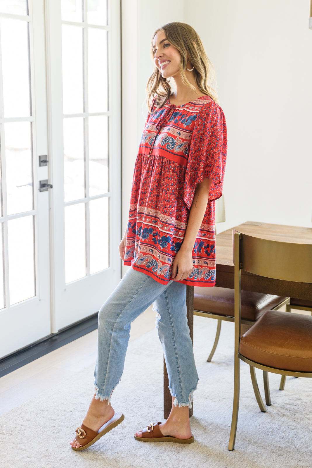 The Easy Street Top is so amazing it gives us butterflies! We are swooning over the bell sleeves, notched neckline with tie detail, babydoll silhouette, and the most amazing paisley and floral print! Pair with your favorite jeans and matching heels and let the top do the rest!
