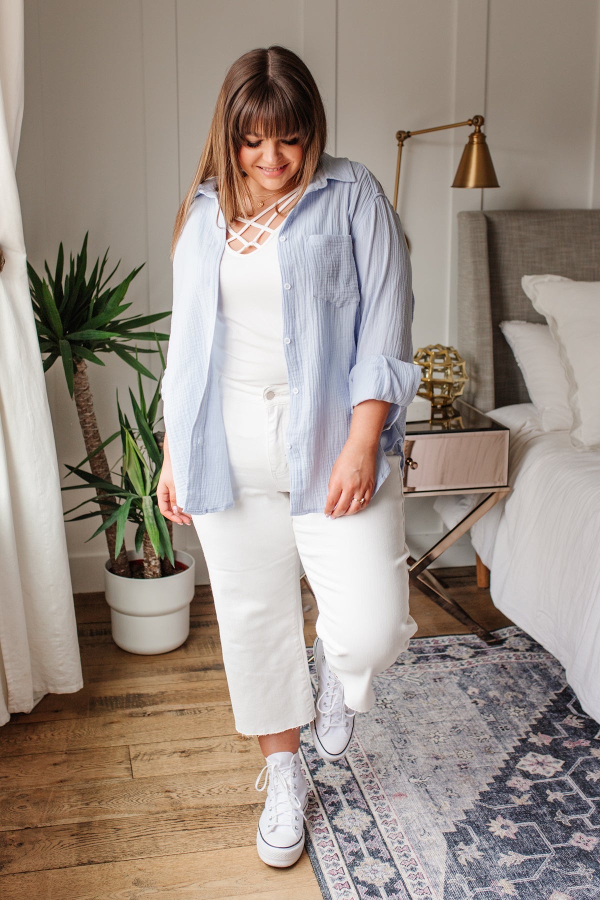 There's no doubt you'll be the cutest in the room in the No Doubts Button Up! This lightweight crinkly top features a collared neckline, front patch pocket,