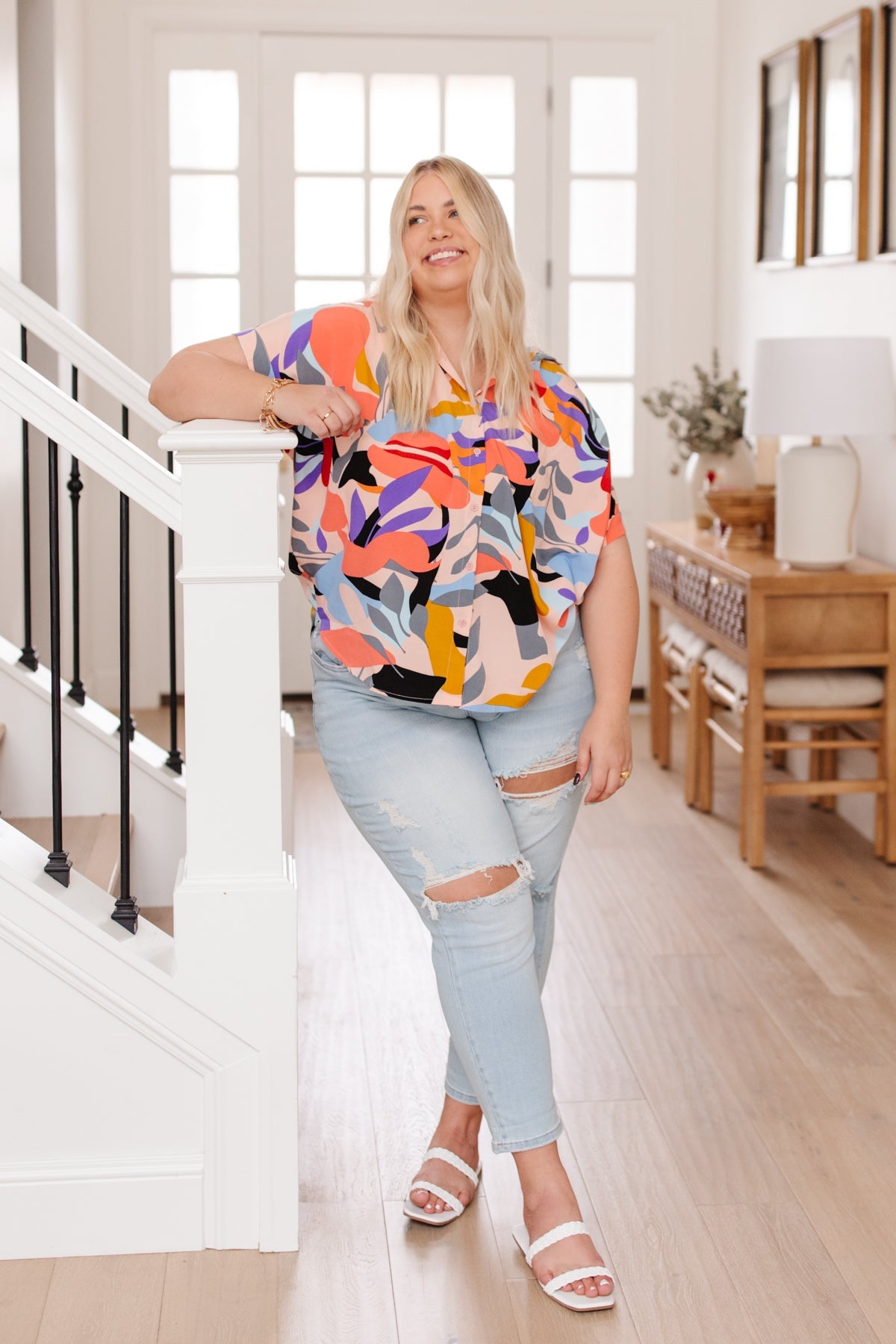 Looking your best is easy in the Working Weekend Top! This funky printed top features a lightweight, flowy fabric, a collared neckline, ruched shoulders, cuffed dolman short sleeves, and boxy silhouette. Pair with white denim and nude sandals for a look you can feel confident in!