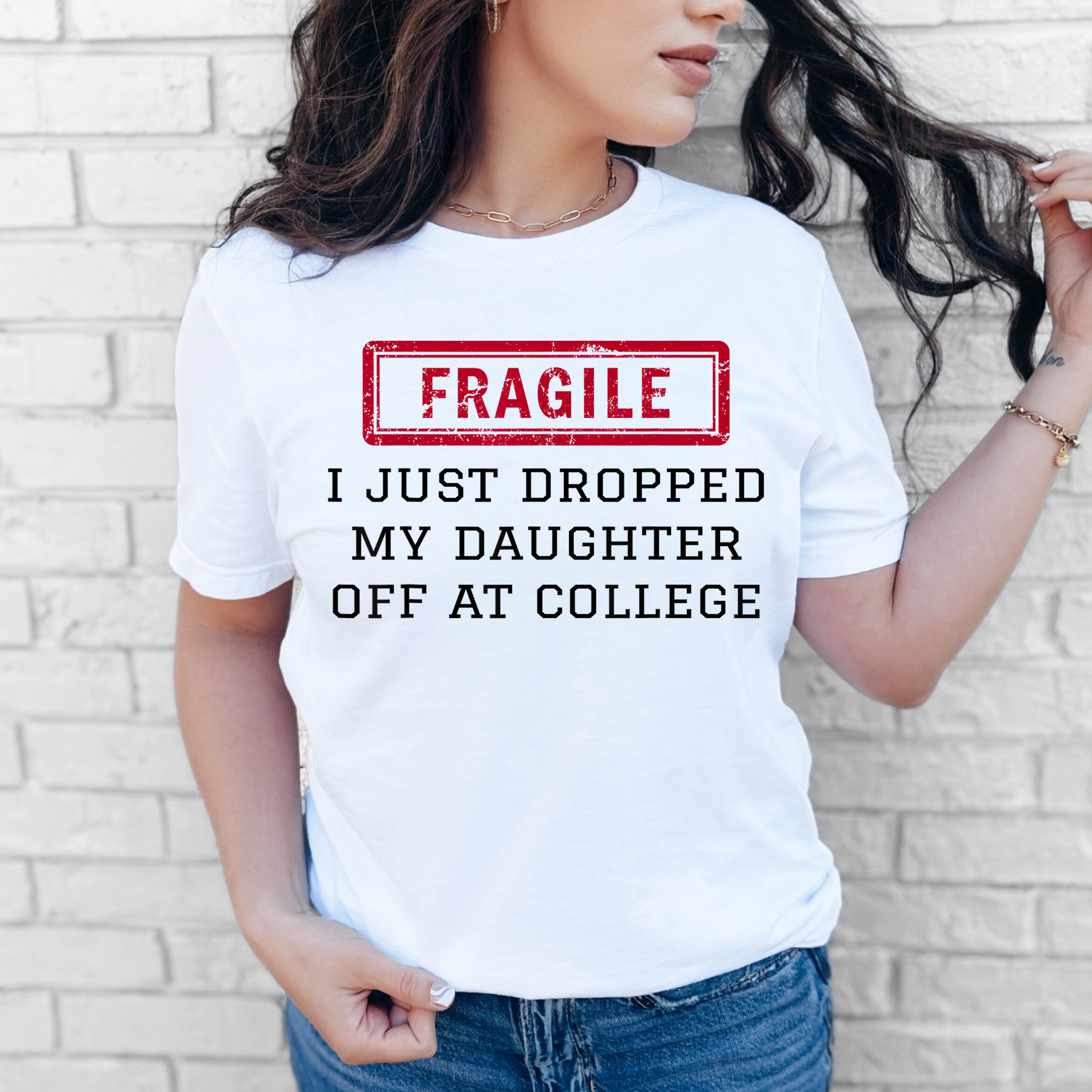 Show off your playful side with the Fragile I Just Dropped off my Daughter Tee. Perfect for proud parents navigating the emotional rollercoaster of college drop-off, this tee combines comfort with a touch of humor. Wear it to lighten the mood and celebrate this big milestone with a smile.