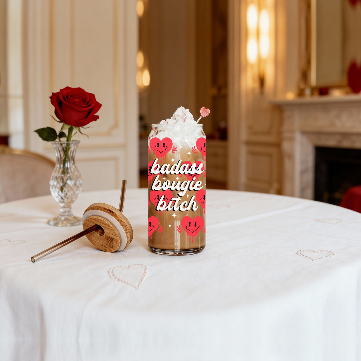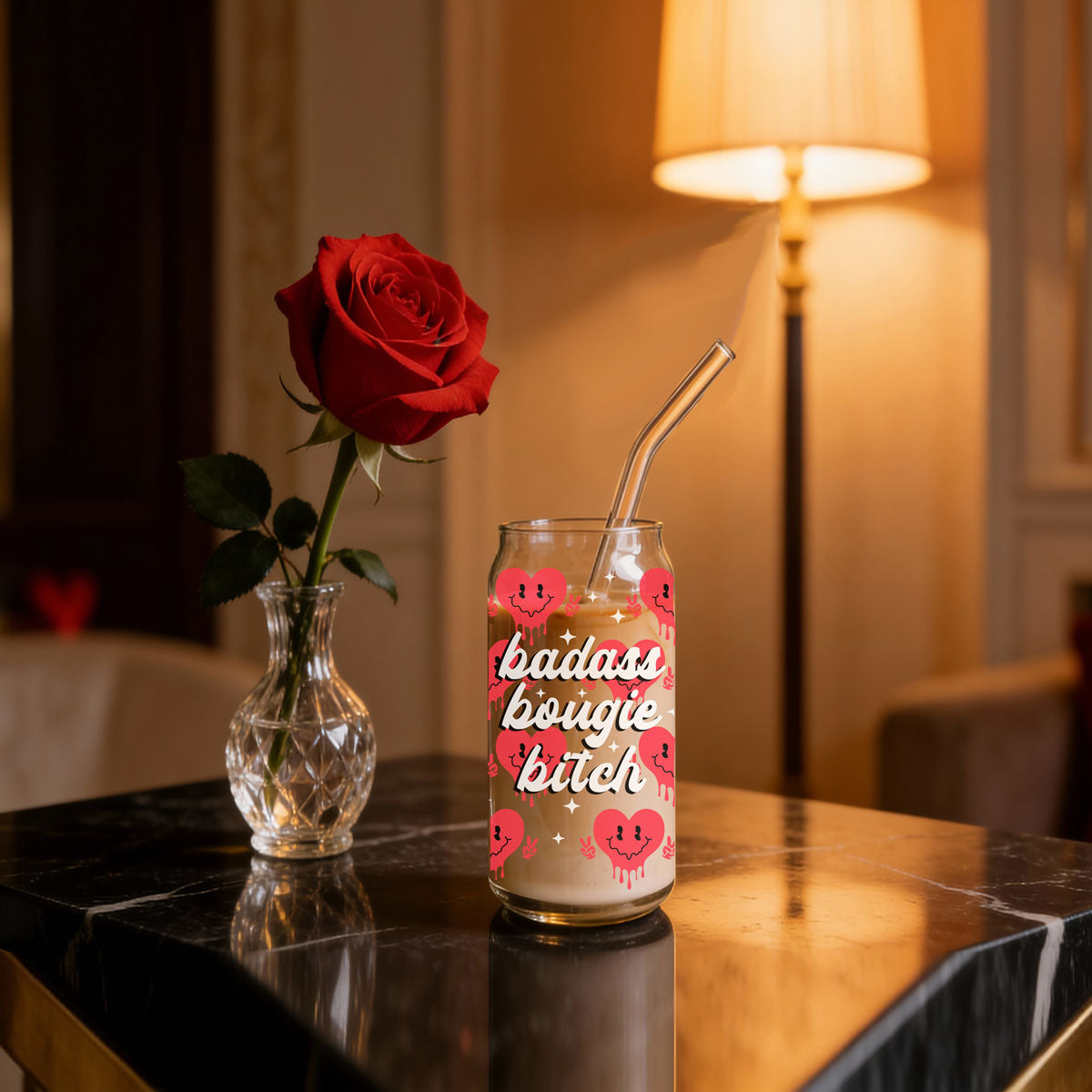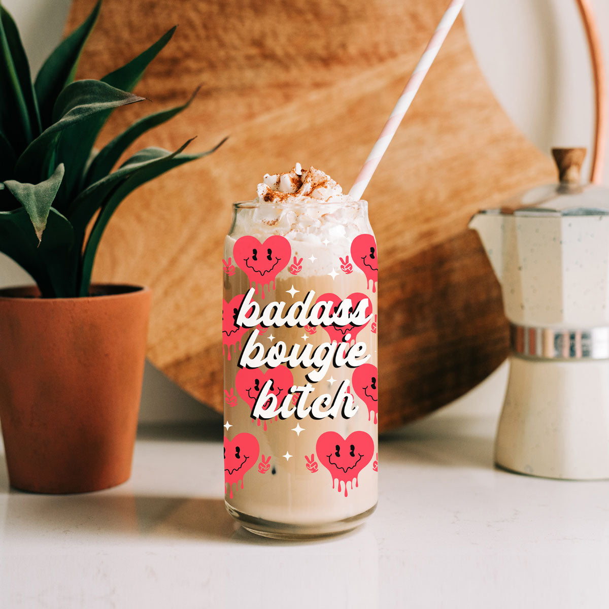 Unleash your inner diva with this fabulous 20oz glass cup that screams confidence! Featuring the bold phrase âBadass Bougie Bitch,â surrounded by melting smiley face hearts throwing up peace signs, this cup is the perfect blend of fierce and fun.