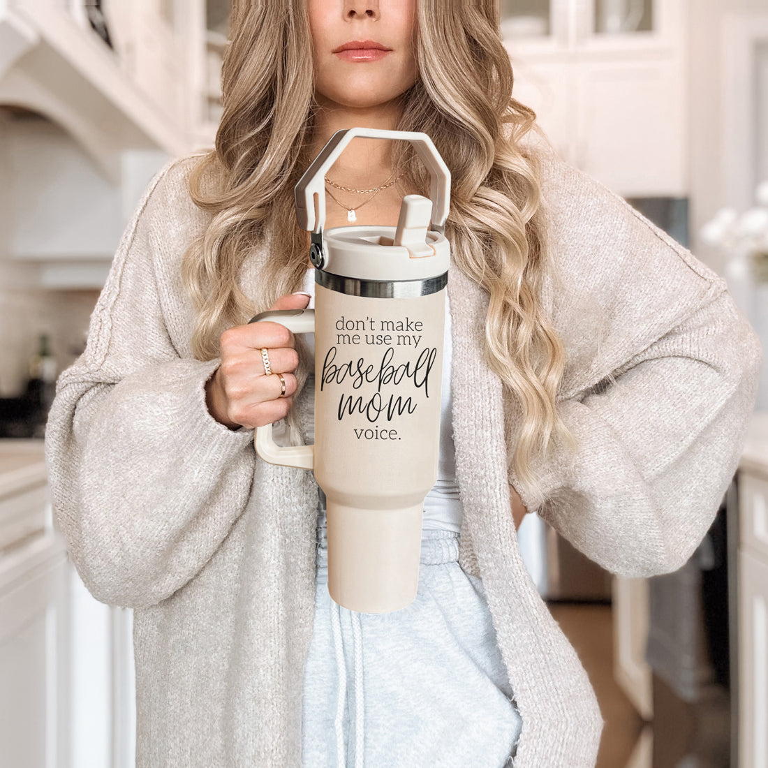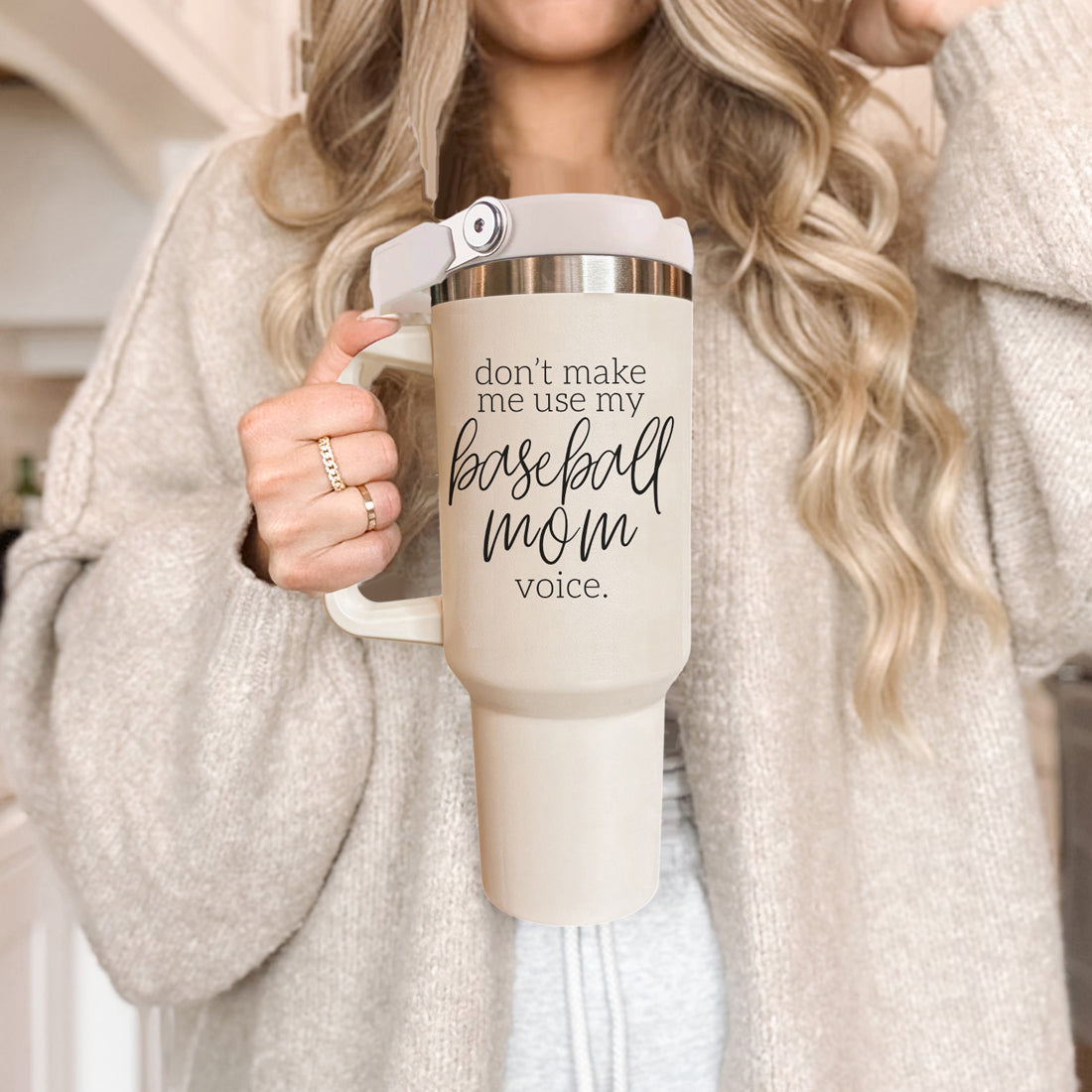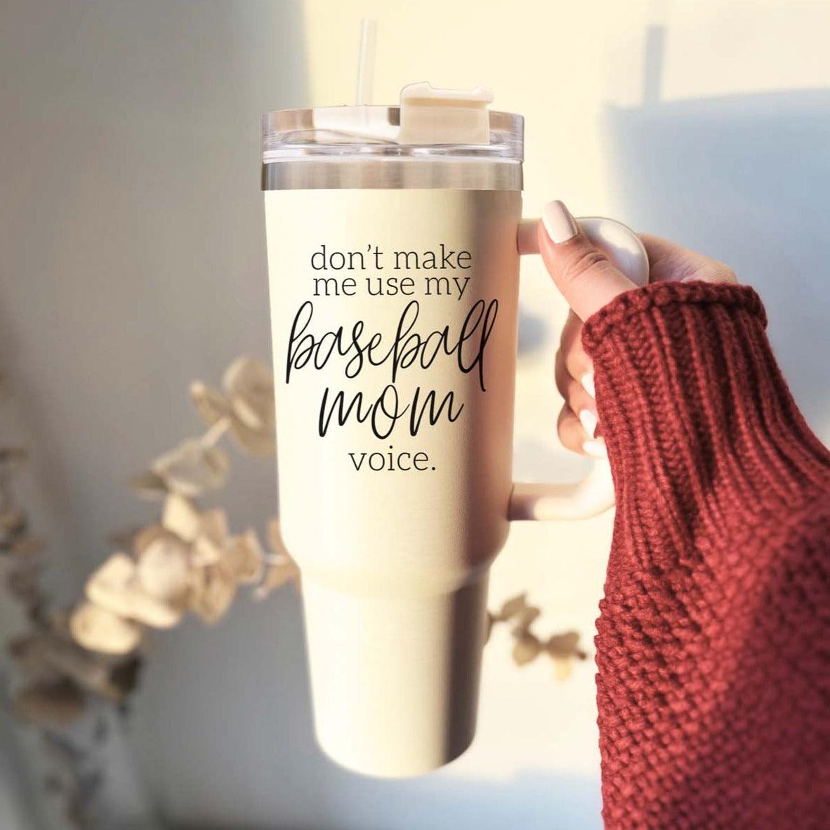 The witty statement "Don't Make Me Use My Baseball Mom Voice" boldly printed on this tumbler reflects your passionate dedication to your baseball star. Embrace the spirit of the game and let this tumbler be your voice of encouragement, even if it's just quietly sipping and channeling that powerful baseball mom energy.