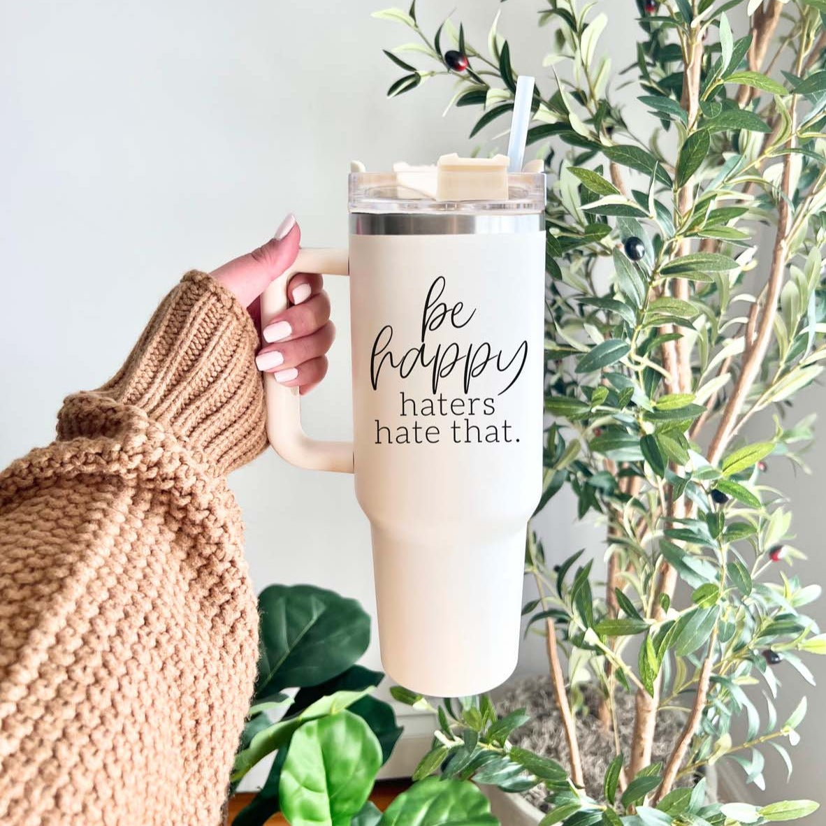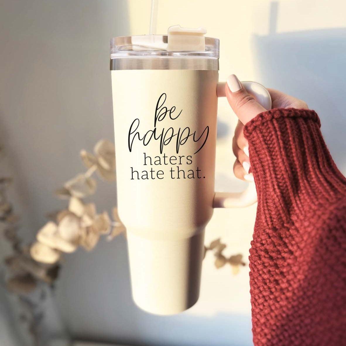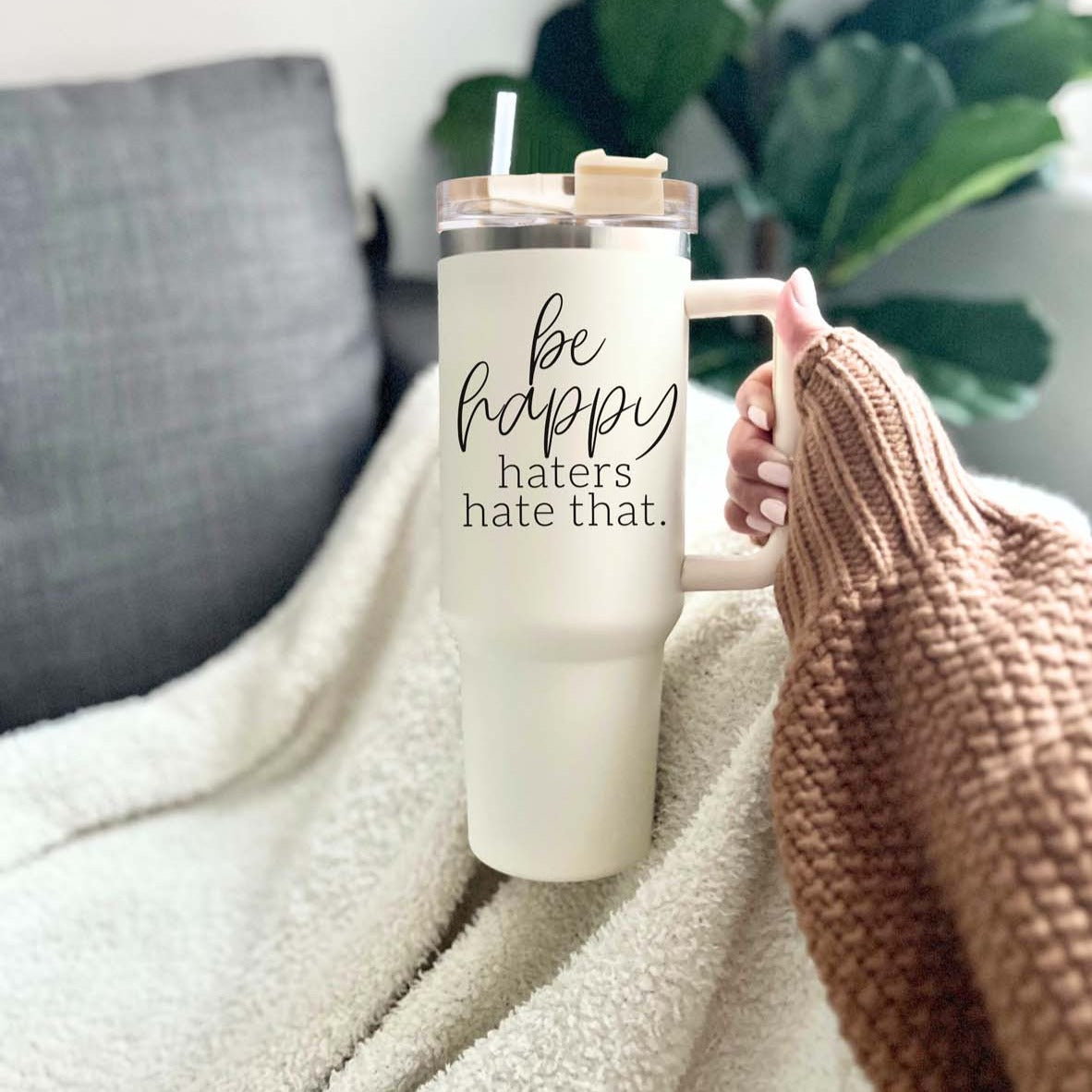 Be Happy Haters Hate That Insulated Mug with handle, lid and straw