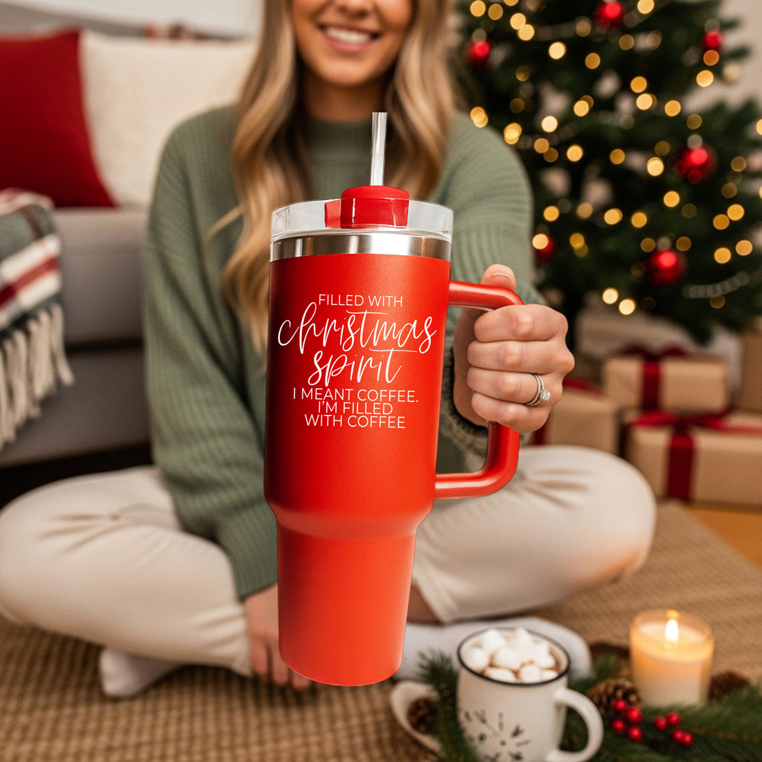 Bring one of a kind Christmas spirit (of the caffeinated variety) to every room with this hilarious 40oz red tumbler cup! With its witty holiday quote about being filled with spirit - or, ahem, coffee - this stylish cup is perfect for a jolly way to kick start your holiday season! So pour yourself a cup of cheer today!