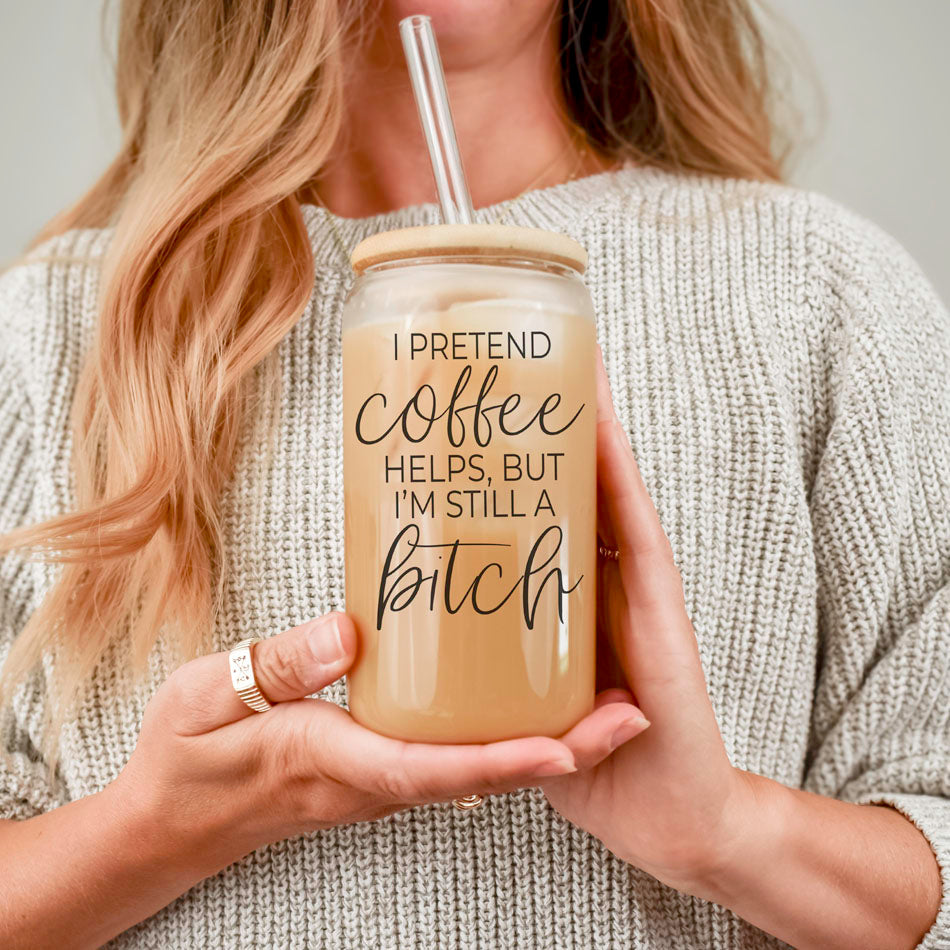 Sip back and relax with a dose of caffeine and a side of attitude! This 20oz glass cup boldly declares “I Pretend Coffee Helps, But I'm Still a Bitch,” because let’s be real—sometimes coffee just can’t fix everything (like that annoying coworker or your never-ending to-do list).