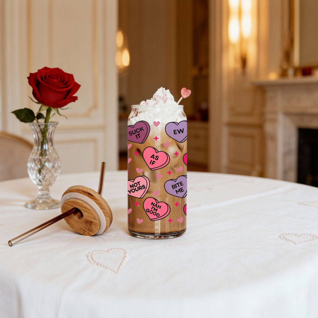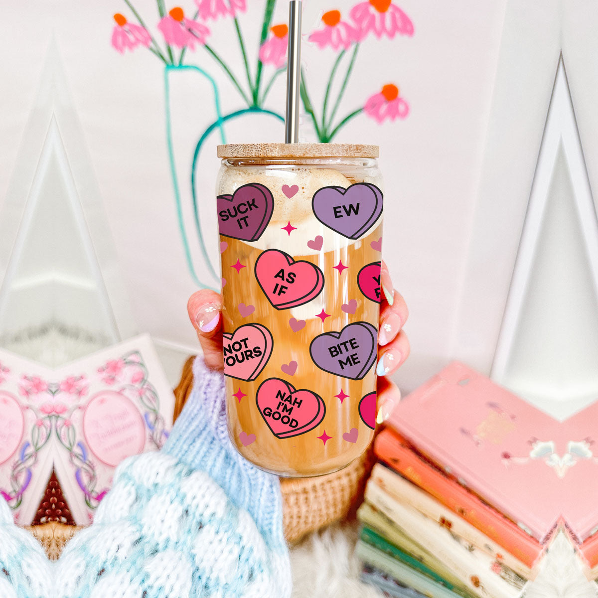 Who says love can’t be a little cheeky? This 20oz glass cup is decked out in hilarious candy hearts that say it all—“Suck It,” “As If,” “Not Yours,” and more! With a whimsical twist on classic candy sayings, this cup brings the sass to your sips and the laughter to your day.