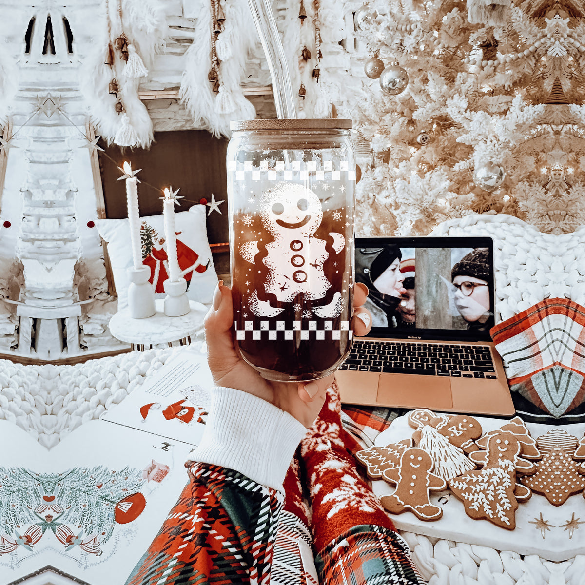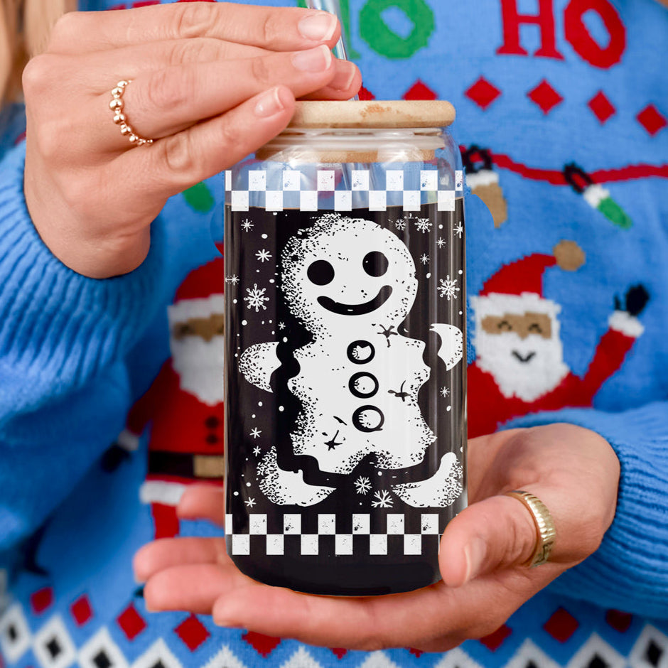 ✨ 17oz glass tumbler featuring the happiest gingerbread man ever drawn
