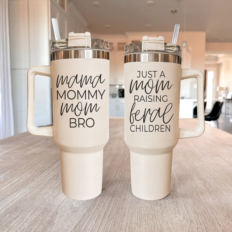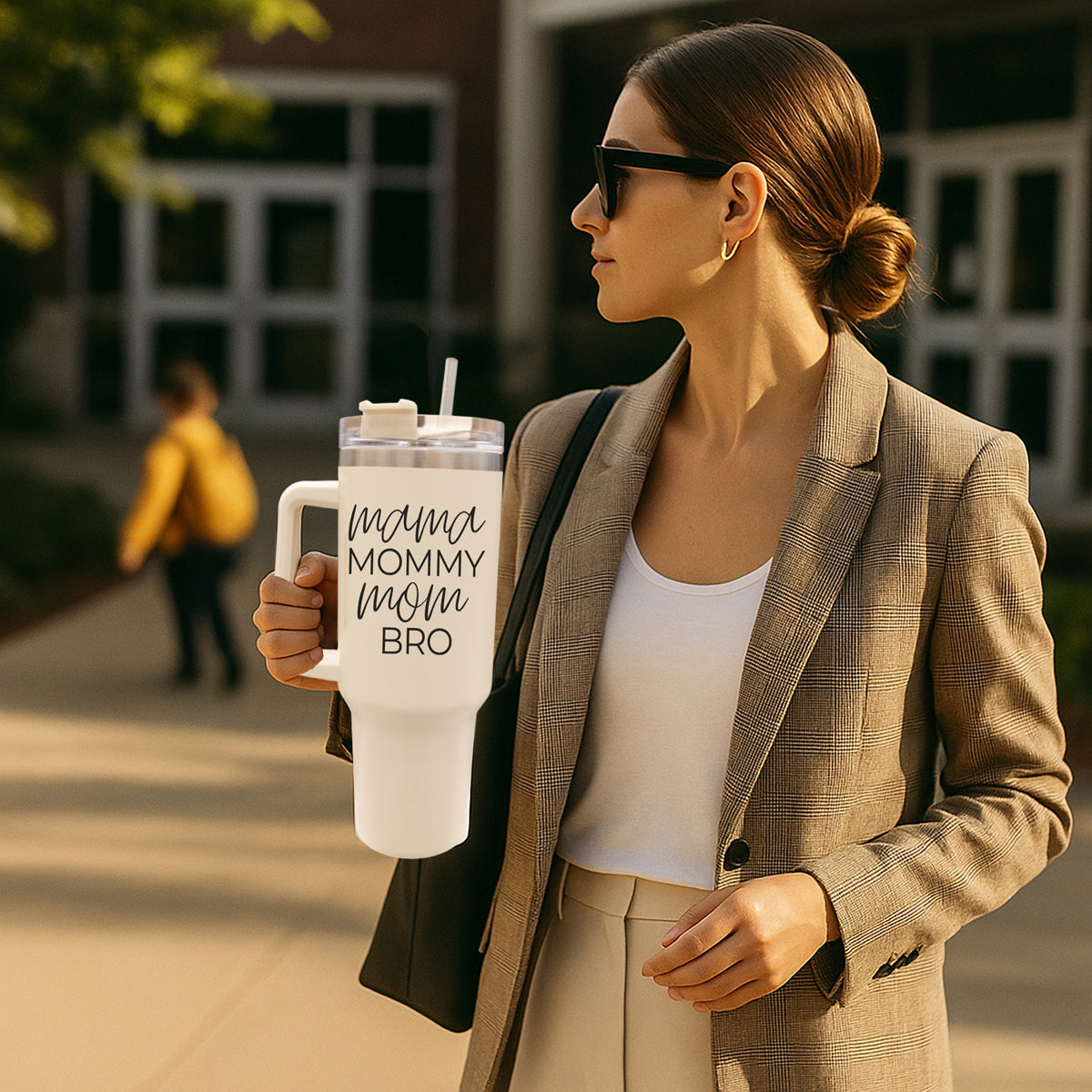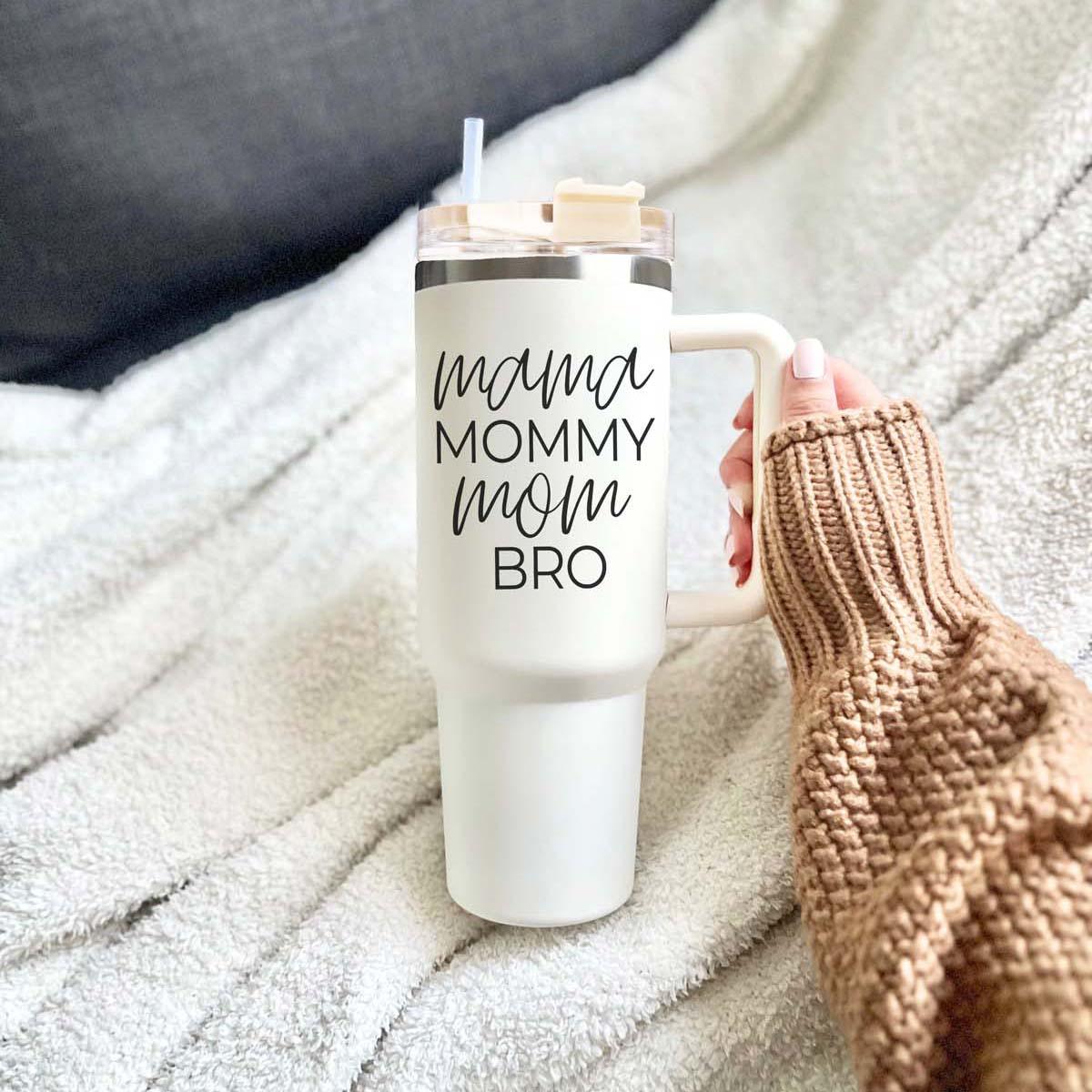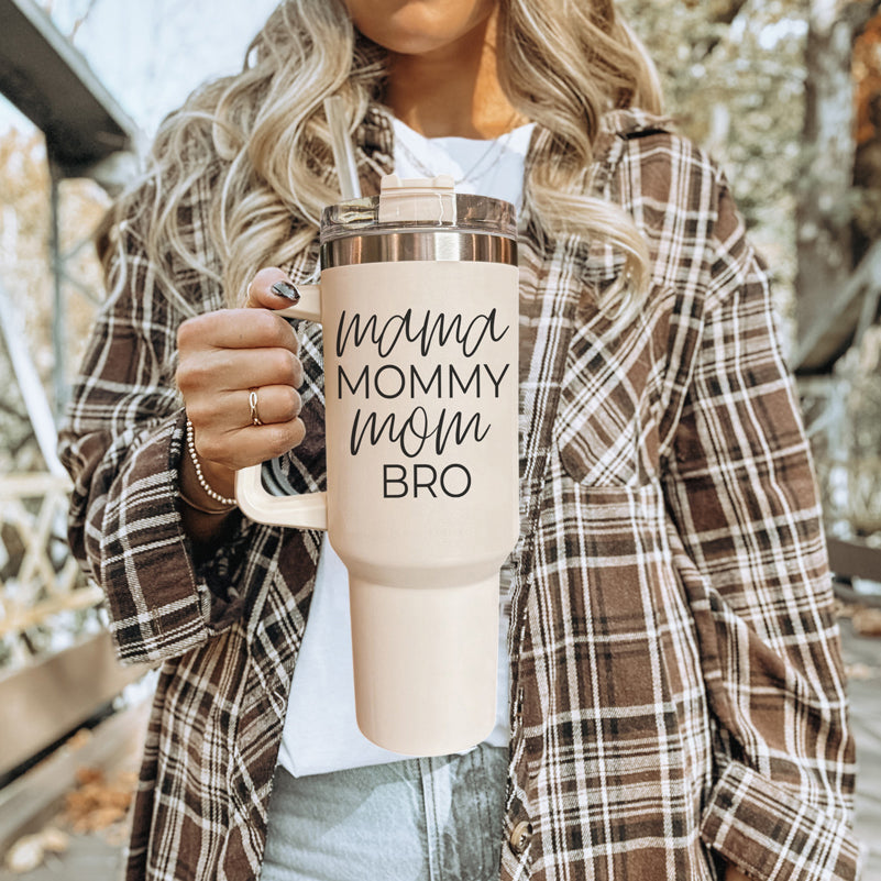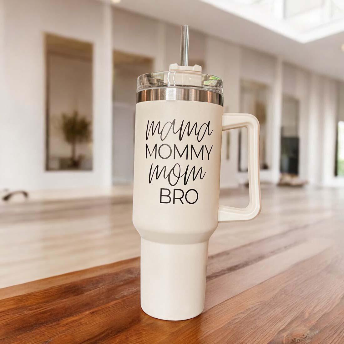 The ultimate accessory for all the multitasking mamas out there – behold the "Mama Mommy Mom Bro" Insulated 40oz Tumbler with handle, lid and straw! 🎉