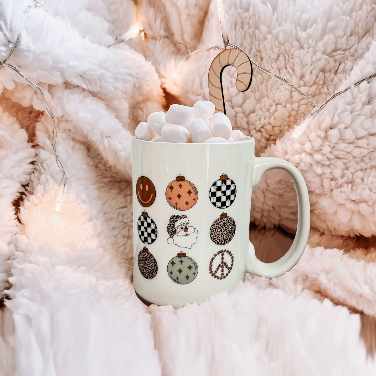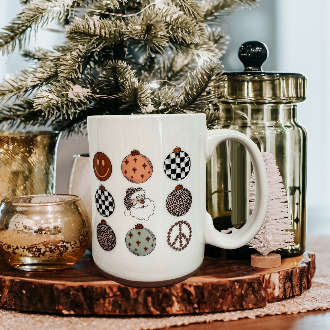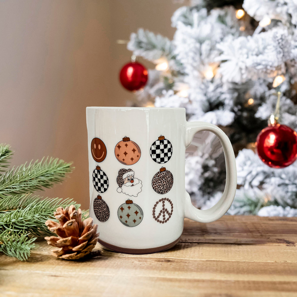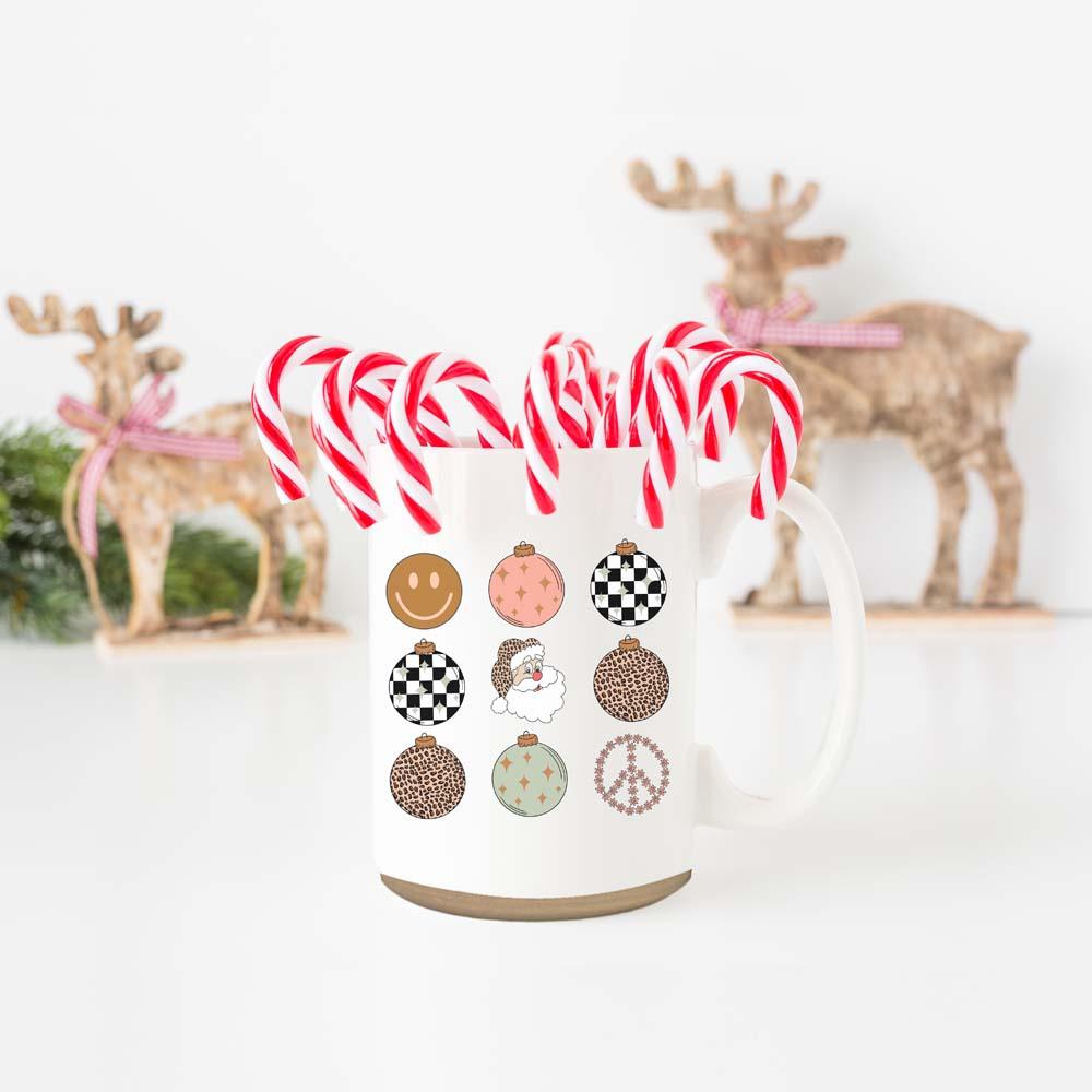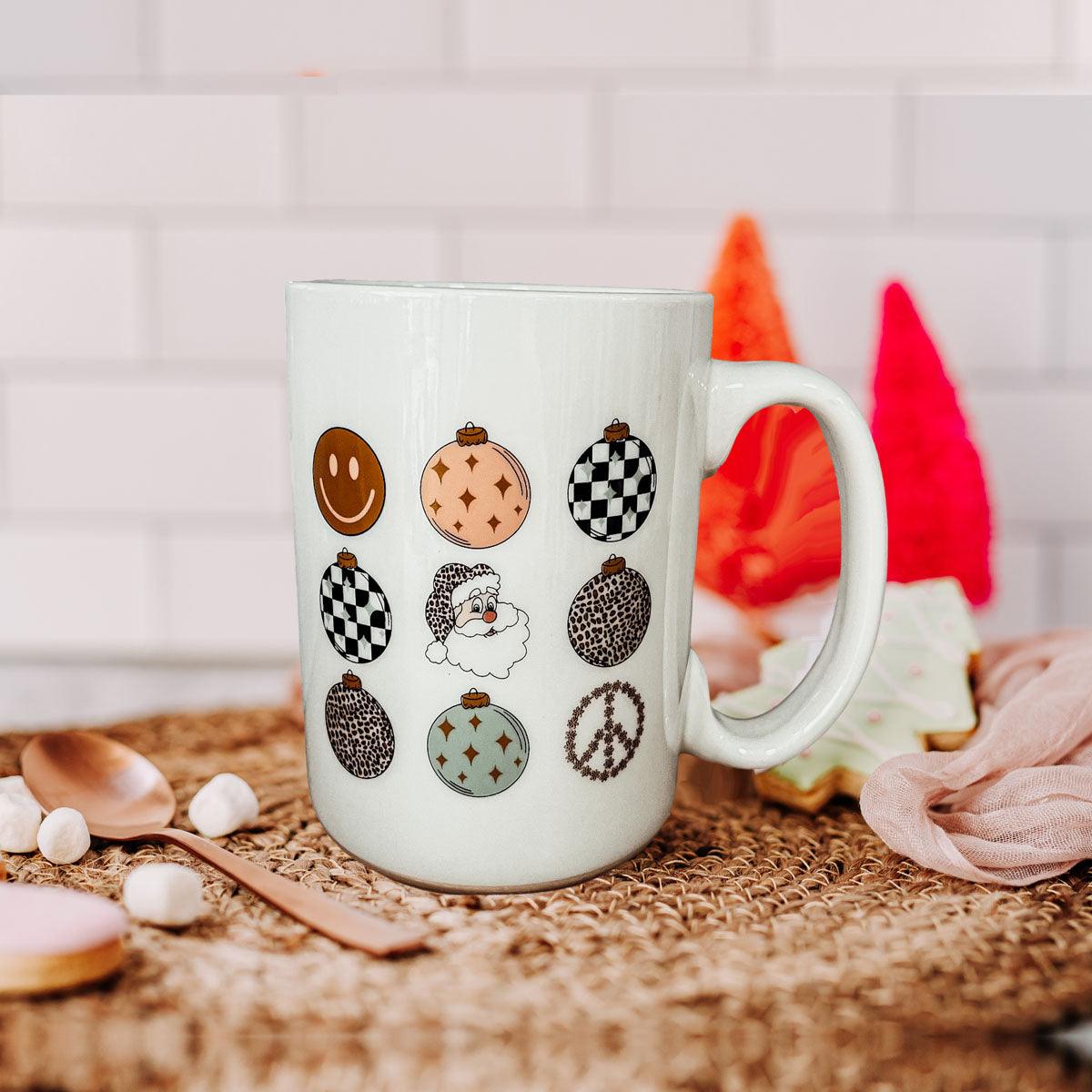 Get ready to add a touch of vintage charm to your holiday season with our Retro Style Christmas Ceramic Coffee Mug! Perfect for those who love a nostalgic twist on festive fun, this mug is adorned with nine delightful circle ornaments, each featuring a unique design like Santa, a smiley face, a peace sign, and more.