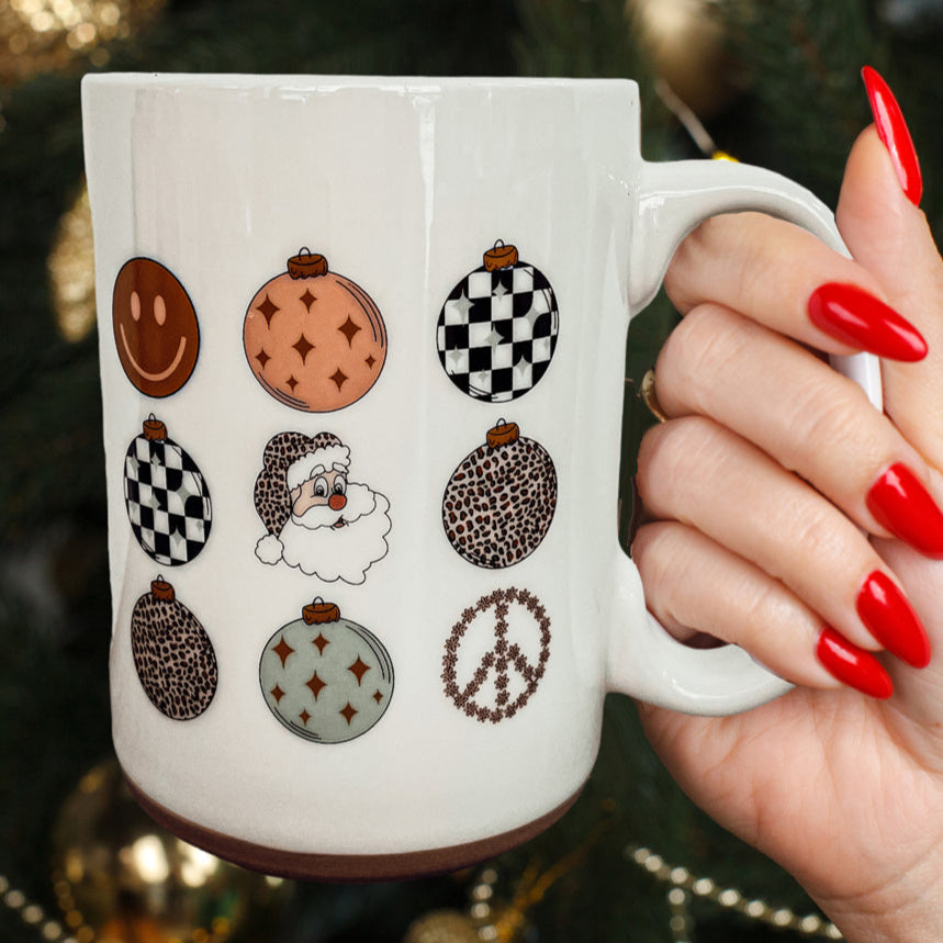 This double-sided mug captures the essence of a classic holiday celebration with a modern mom’s sense of humor. Both sides showcases the colorful ornaments in all their retro glory,.