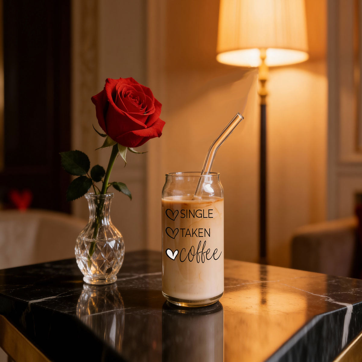 Let’s face it: nothing compares to a solid relationship with coffee! This 20oz glass cup declares your true love status with “Single, Taken, Coffee” and features a heart filled in with white next to “Coffee”—because let’s be real, that’s the only romance we really need!