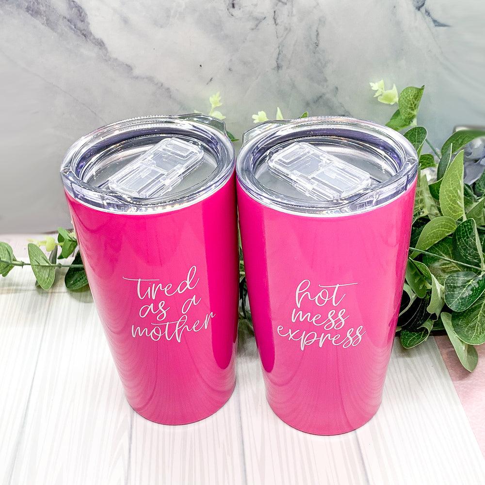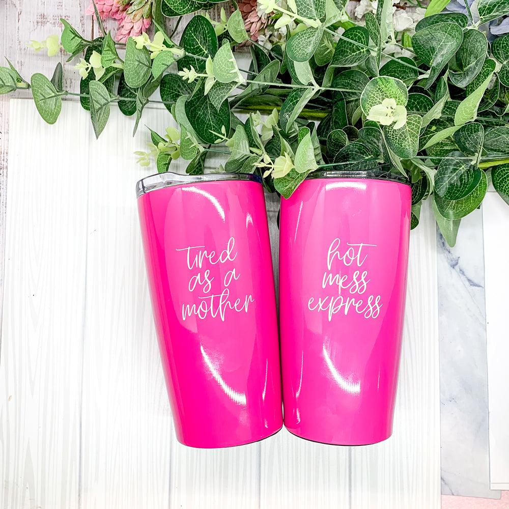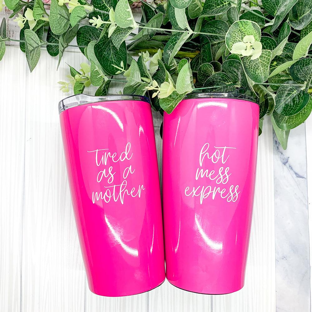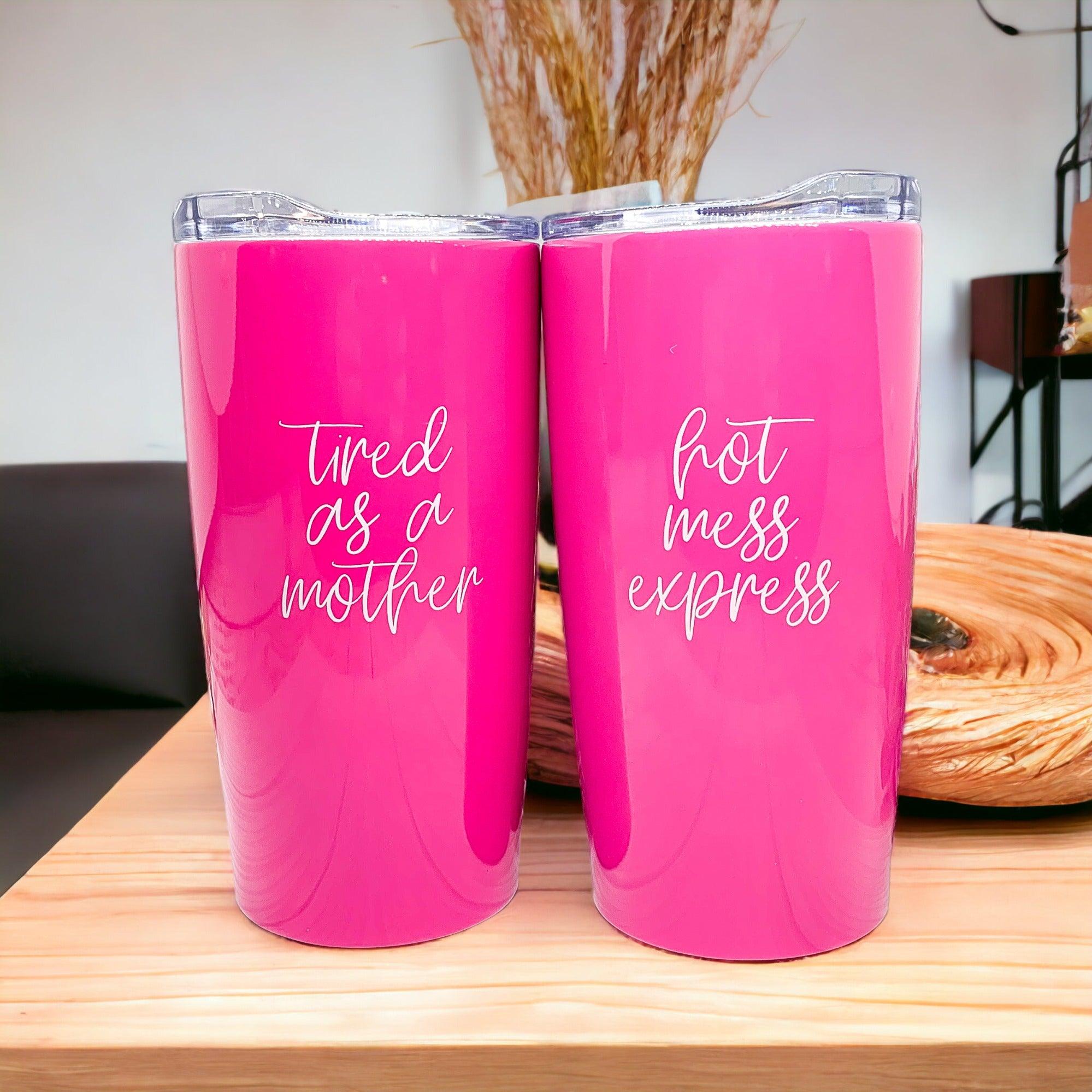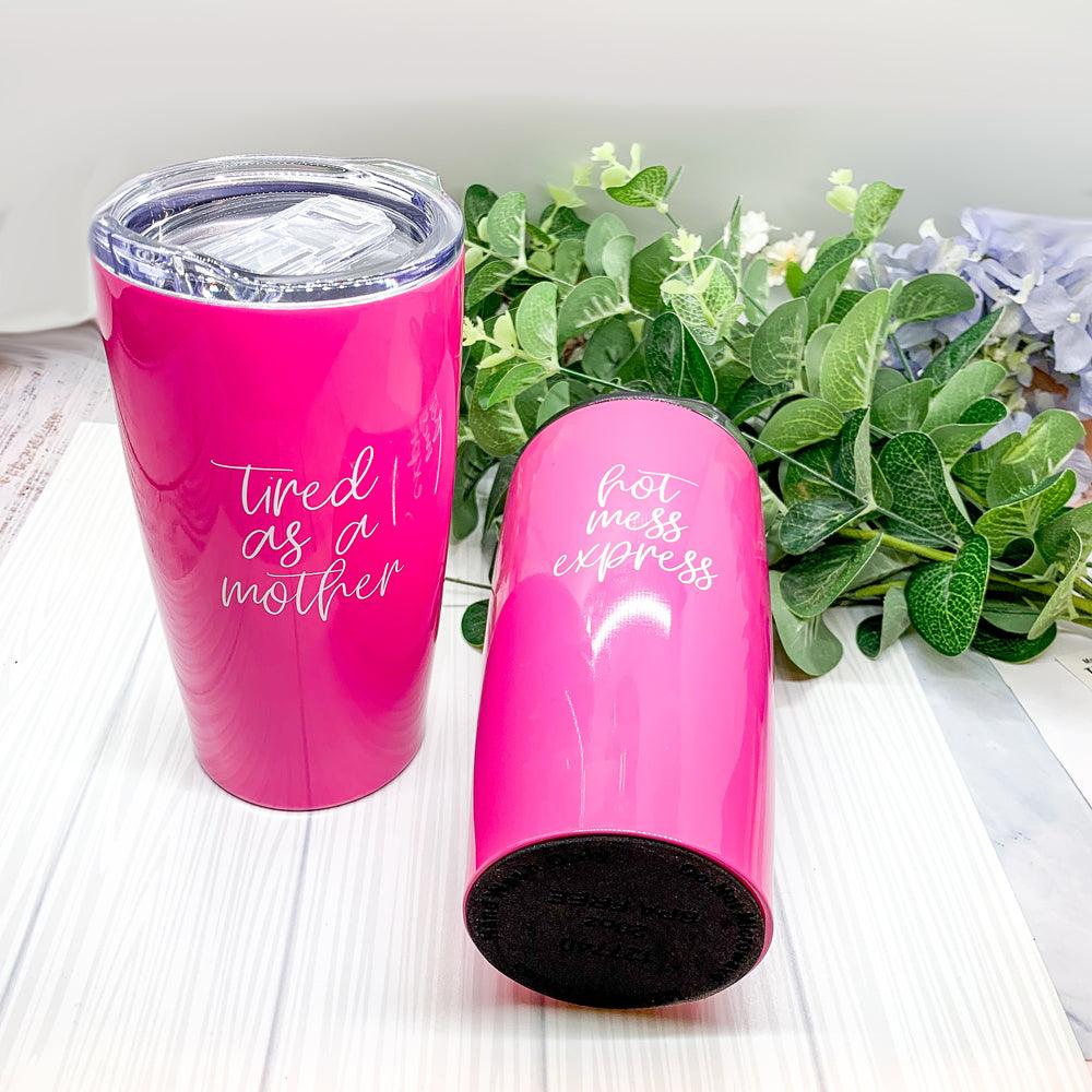 A customer favorite "Tired as a Mother" now available on these gorgeous Pink Travel mugs!