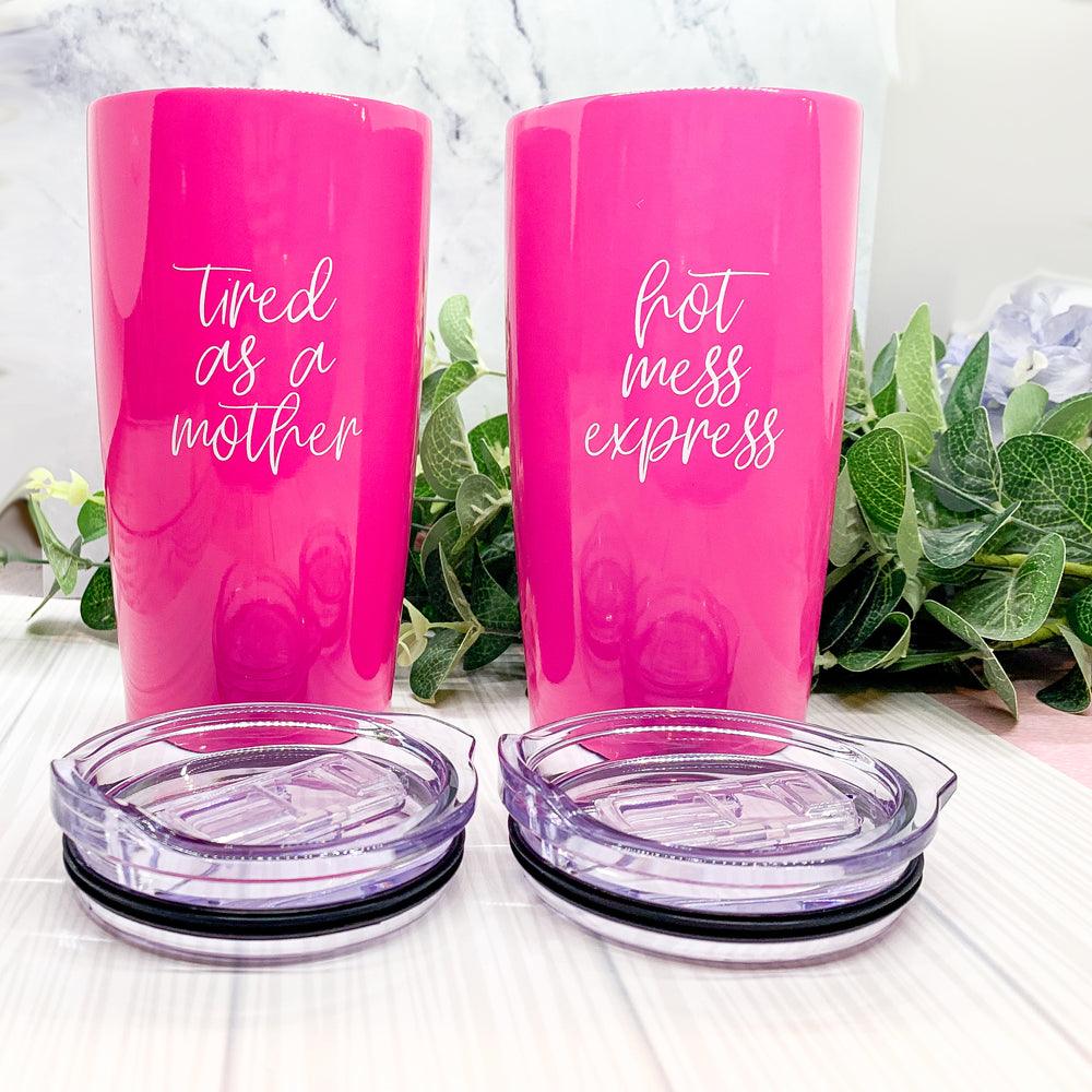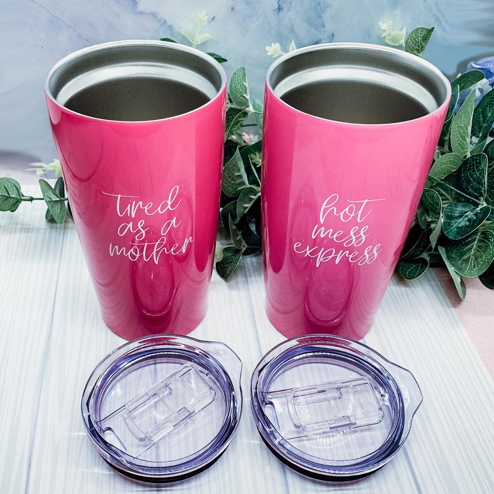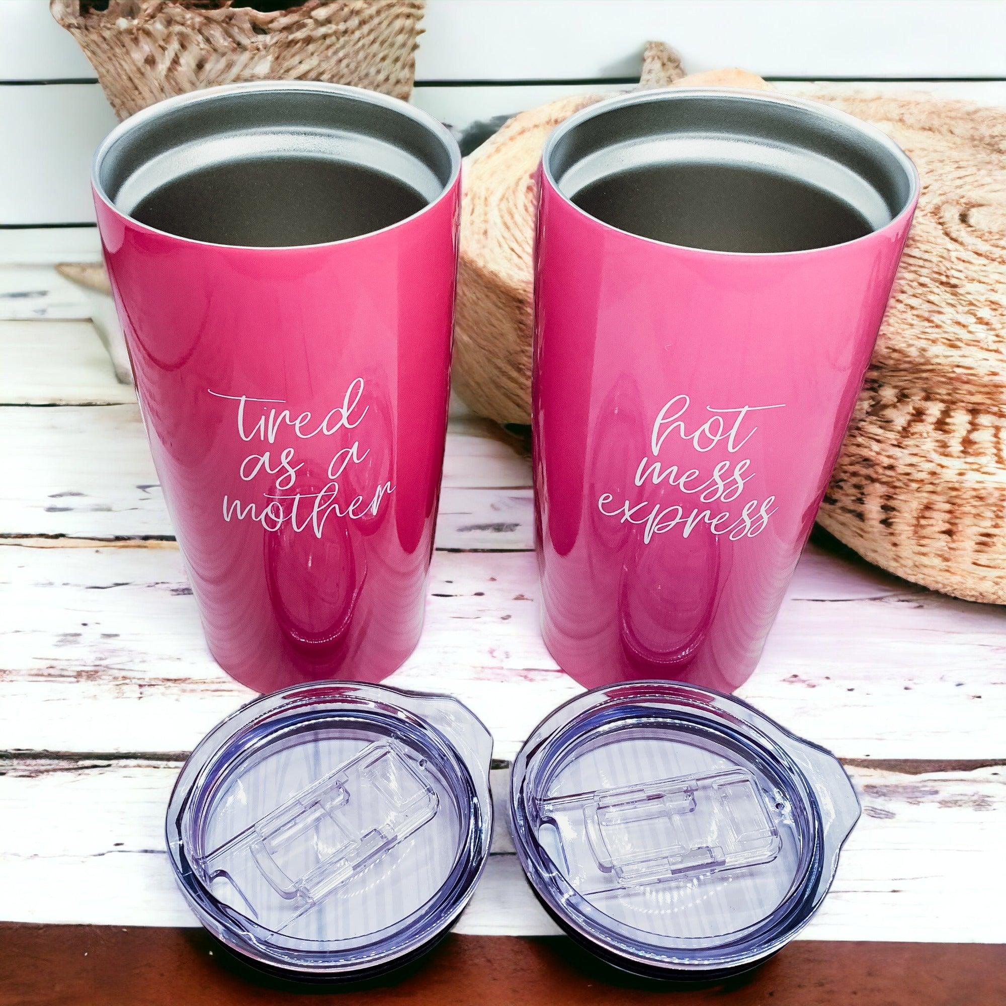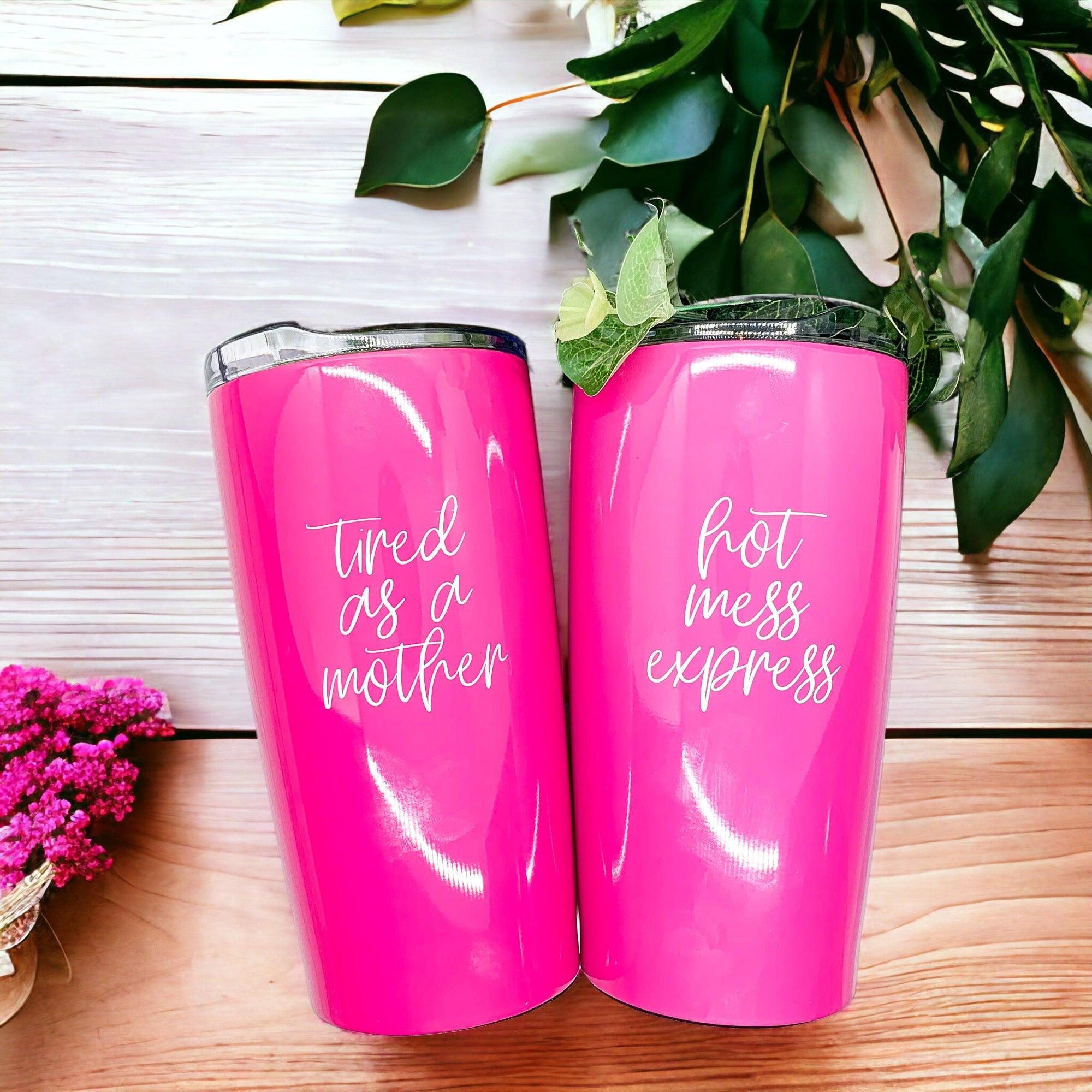 A customer favorite "Tired as a Mother" now available on these gorgeous Pink Travel mugs!