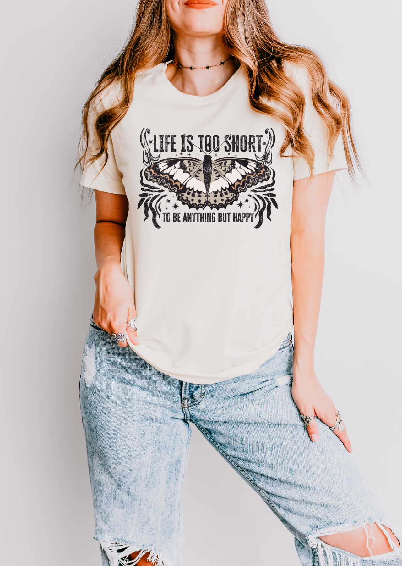 Celebrate every moment with the Life Is Too Short, Be Happy Tee! This playful shirt reminds you to embrace joy and spread good vibes wherever you go. Made for comfort and style, it’s perfect for brightening your day and lifting spirits around you. Wear happiness proudly!