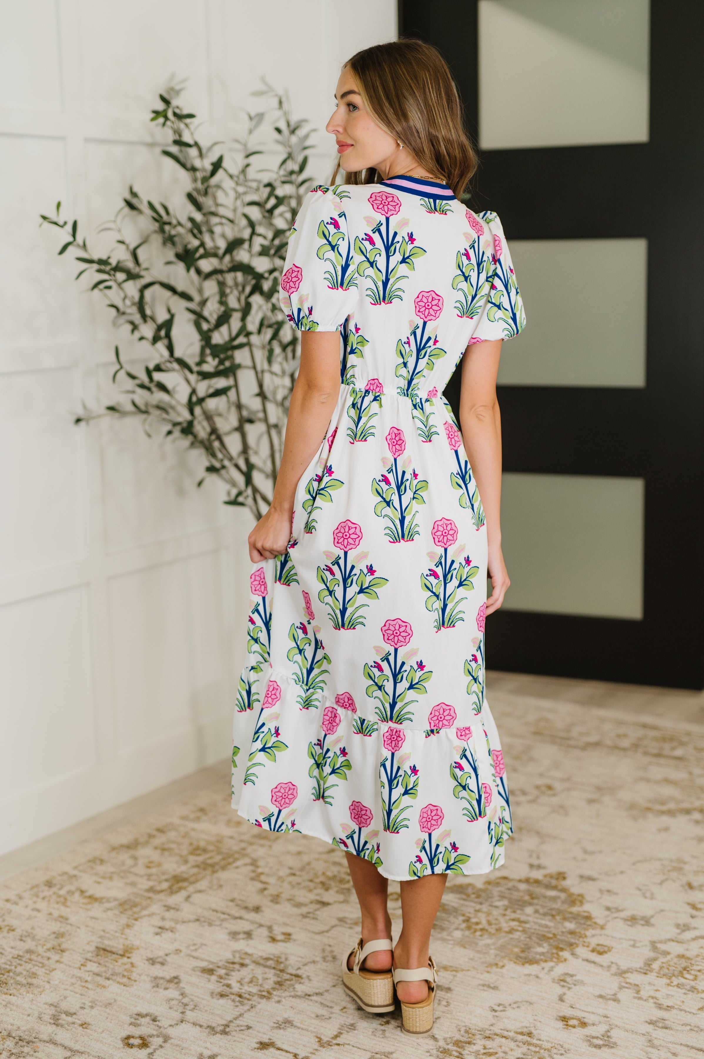 Bring playful hippie vibes to your wardrobe with this floral print Boho V-Neck Balloon Sleeve Dress. Crafted from crisp poplin woven fabric, it features a contrast banded V-neckline and snap button closure for easy style. Balloon sleeves with cased elastic cuffs add volume, while the elastic waistband and gathered tier create a flattering, flowy silhouette. Functional side pockets complete this fun and effortless look perfect for any sunny day adventure.