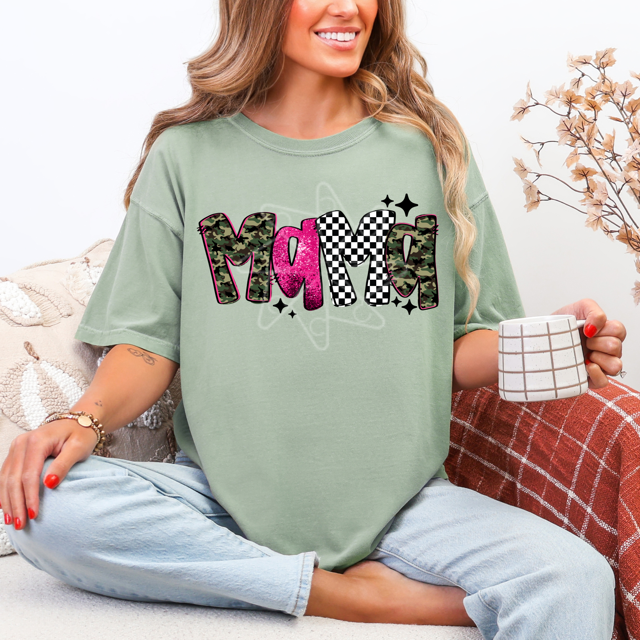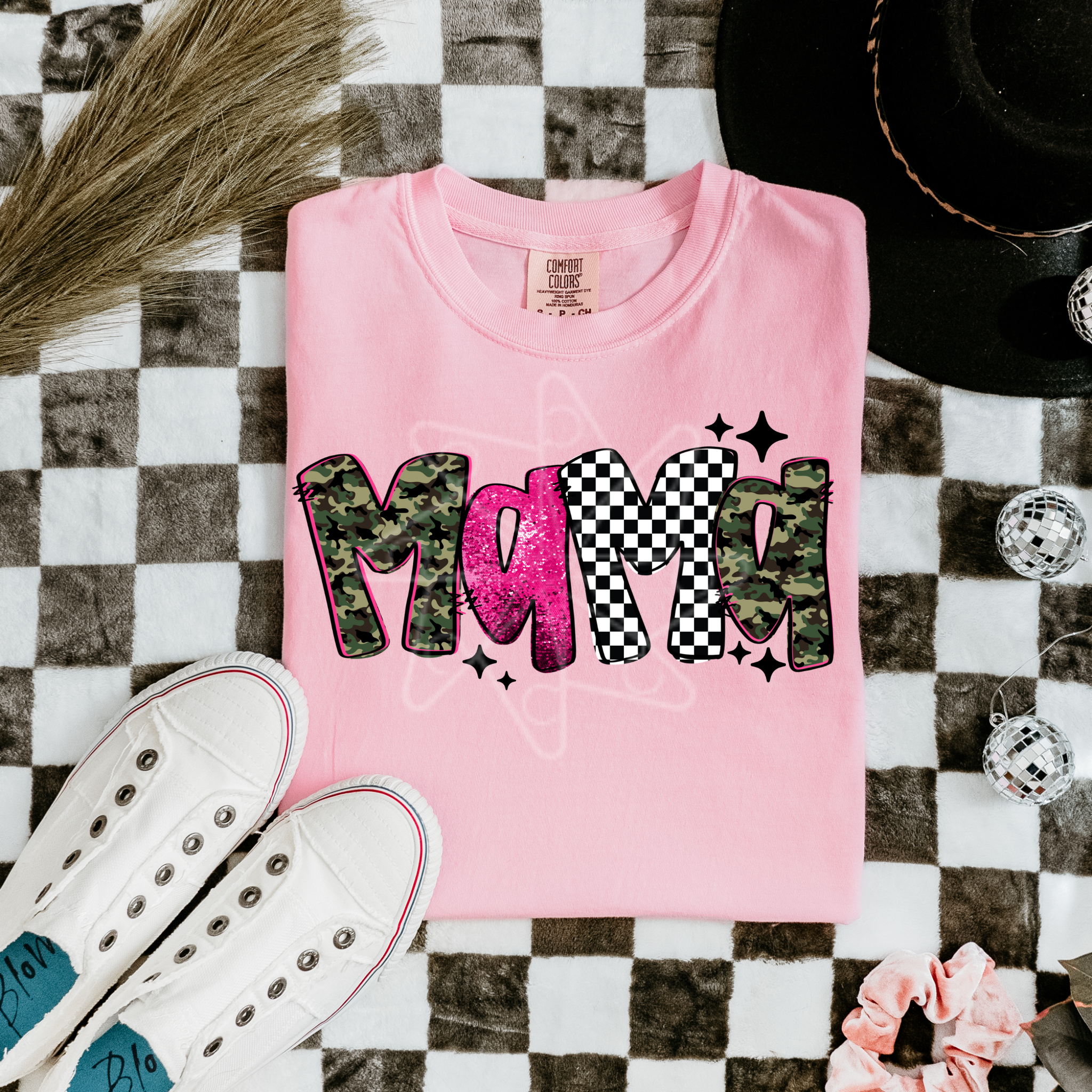 Show off your fun-loving spirit with the Mama Camo Checkered Tee! This playful blend of bold camo and classic checkered print brings a unique twist to your casual style. Perfect for moms who want to add a little edge and cheer to their wardrobe while staying comfy all day long.