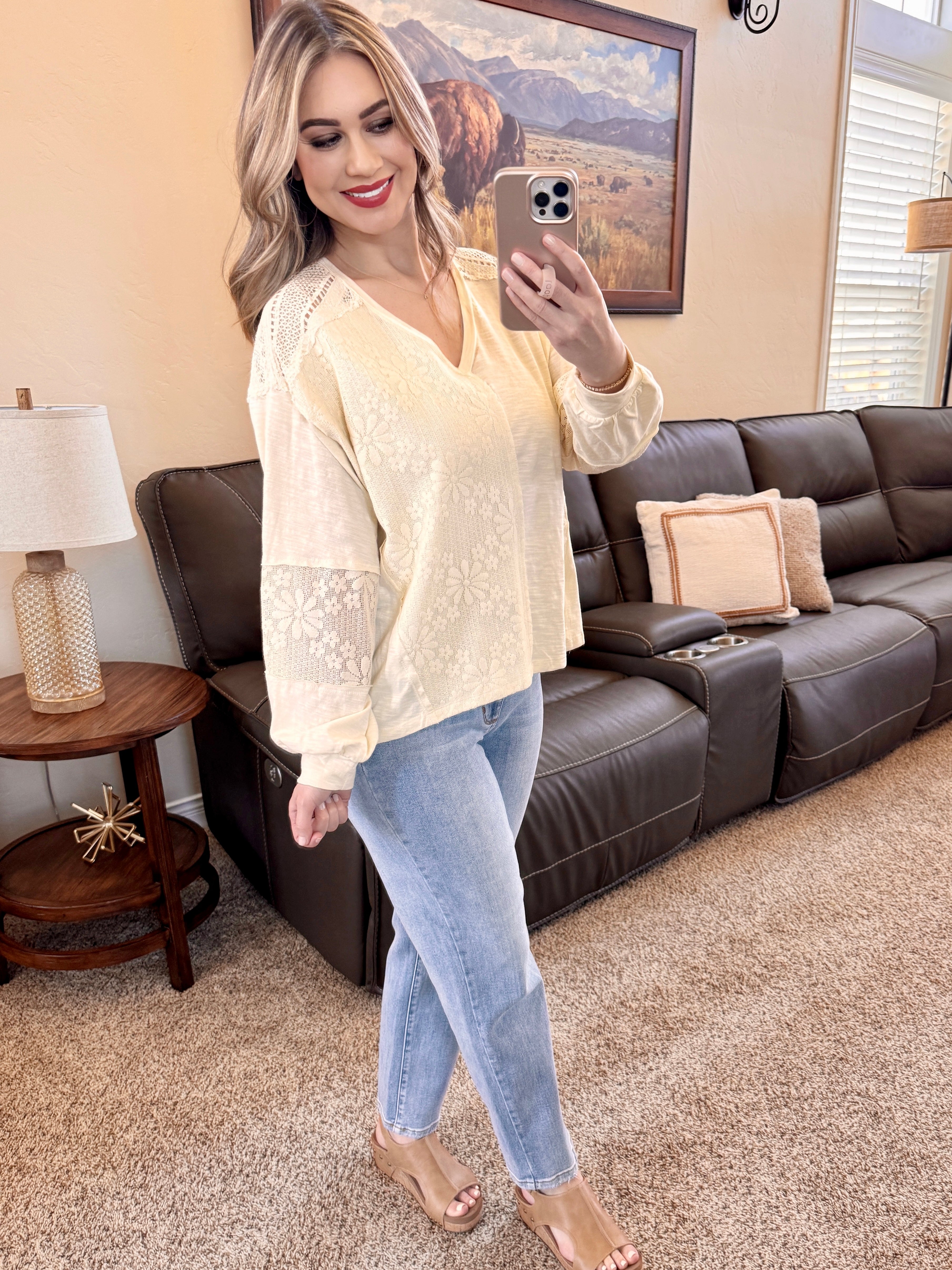 Long Sleeve Floral Crochet Top In Cream