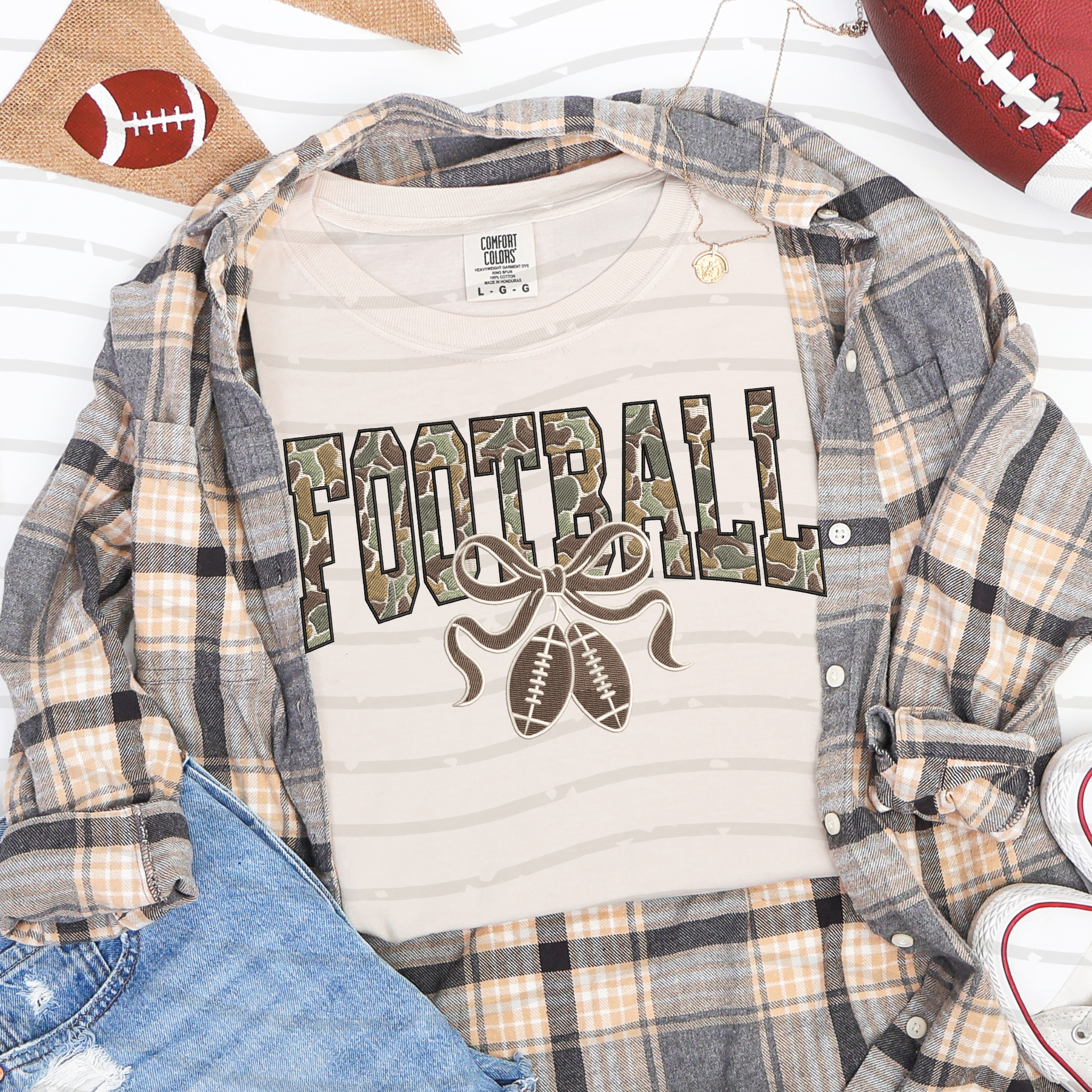 Score style points with the Camo Football Coquette Bow Tee! This playful tee combines sporty camouflage with a cute bow detail, making it perfect for game days or casual outings. Its soft fabric keeps you comfy, while the unique design adds a fun twist to your everyday look. Ready to cheer on your team in style? This tee’s got you covered!