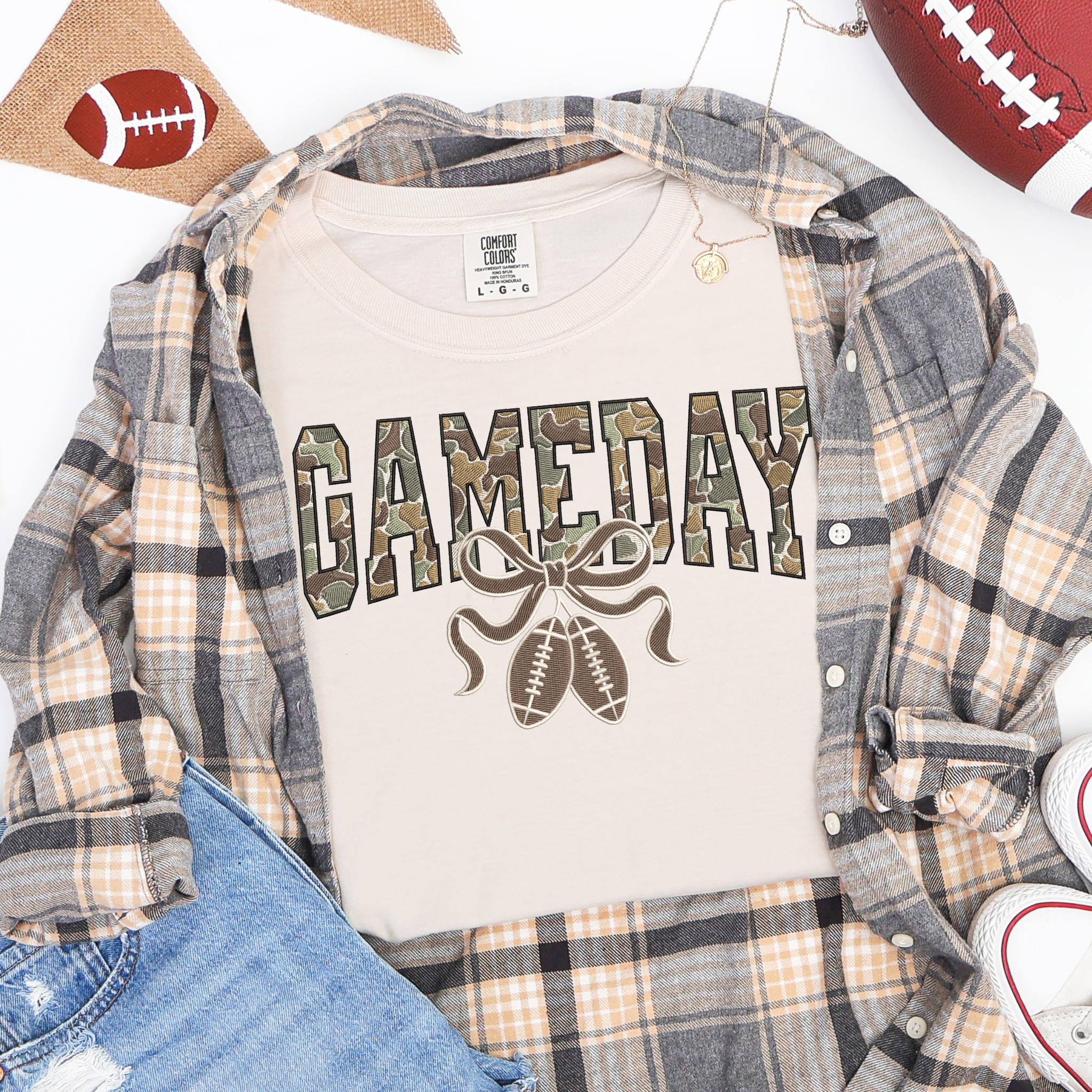 Get ready to turn heads with the Camo Game Day Coquette Bow Tee! This playful tee blends trendy camo print with a flirty bow detail, making it perfect for game day or everyday fun. Soft and comfortable, it keeps you stylish while cheering on your team or hanging out with friends. Add a touch of charm to your casual wardrobe with this fun and effortless look!