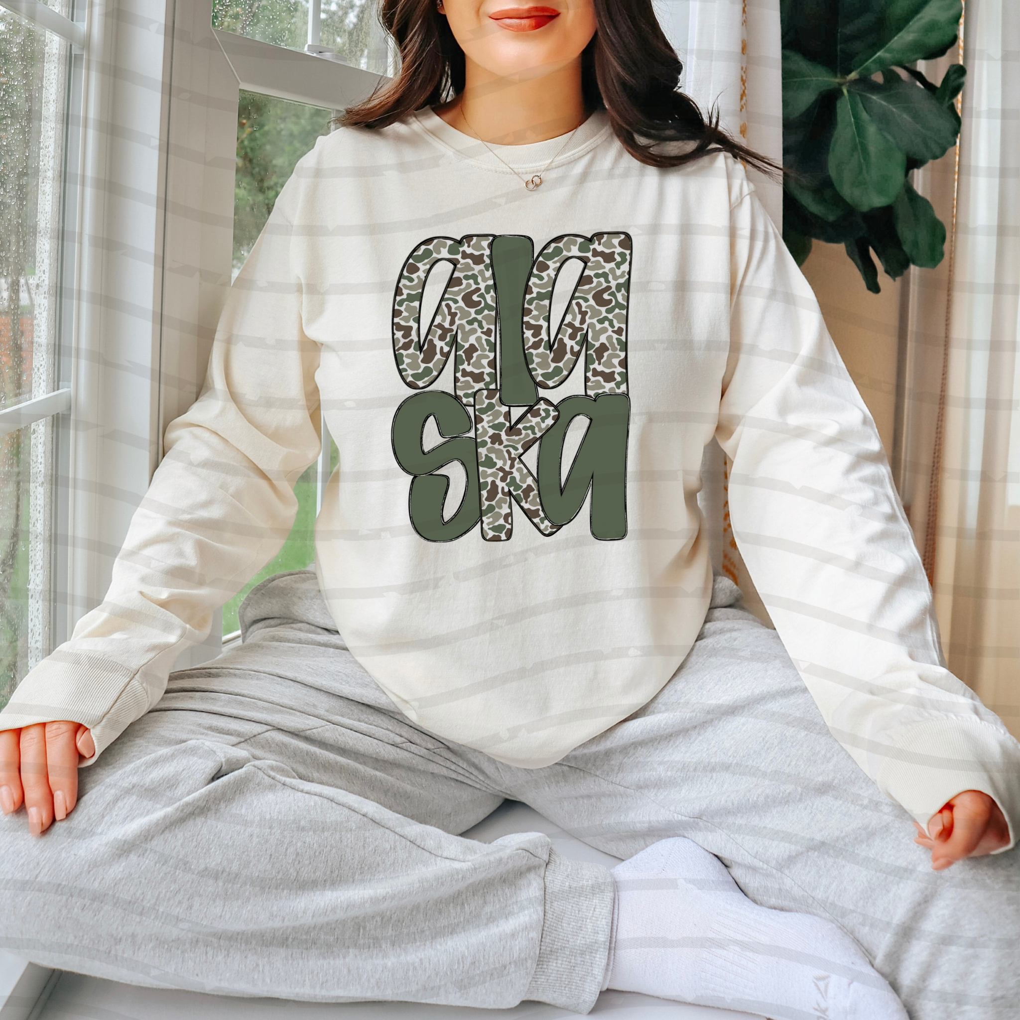 Embrace the wild with the Camo Alaska Long Sleeve! Designed for exploring the great outdoors—or just conquering your couch—this shirt blends classic camouflage with cozy comfort. Perfect for layering on crisp mornings or adding a dash of adventure to your everyday look. Whether you're hunting or just hunting for the remote, this long sleeve has got you covered in style and warmth.
