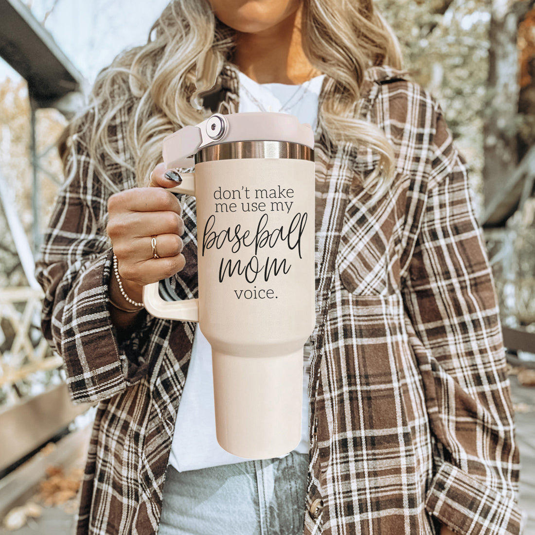 The witty statement "Don't Make Me Use My Baseball Mom Voice" boldly printed on this tumbler reflects your passionate dedication to your baseball star. Embrace the spirit of the game and let this tumbler be your voice of encouragement, even if it's just quietly sipping and channeling that powerful baseball mom energy.