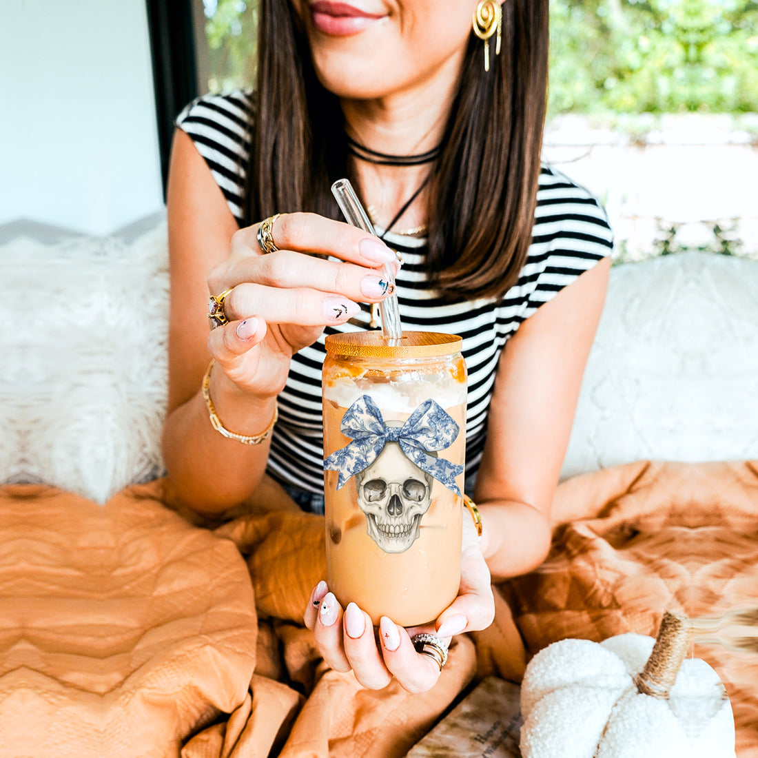 Meet the tumbler that proves being dead doesn't mean you can't be fabulous! This 20oz glass masterpiece features our signature skull wearing a gorgeous blue and white Chinoiserie bow - because who says the afterlife can't be stylish?