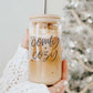 Our glasses with bamboo tops. Drink it with the top and straw of choice, remove the bamboo lid and drink straight from the glass.
