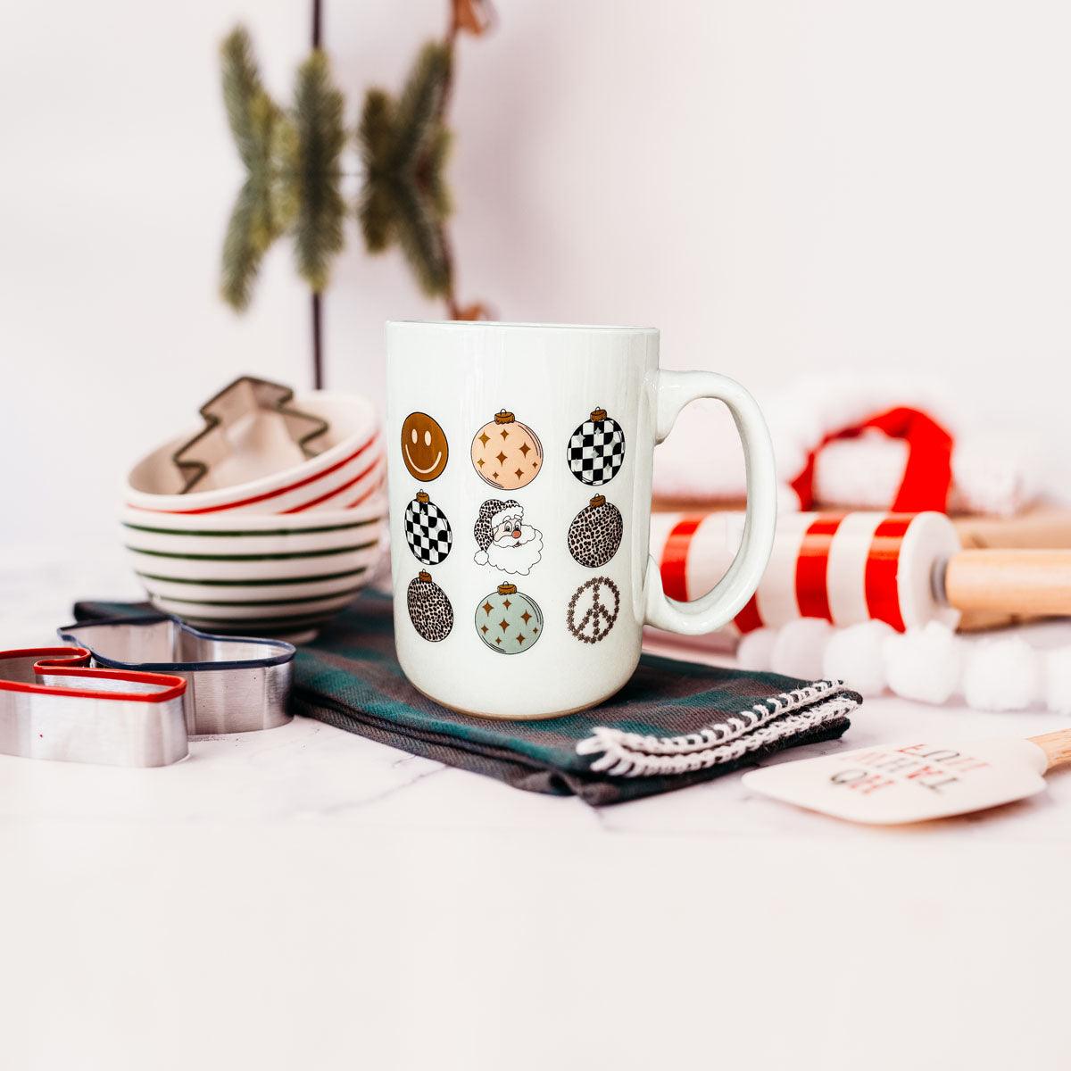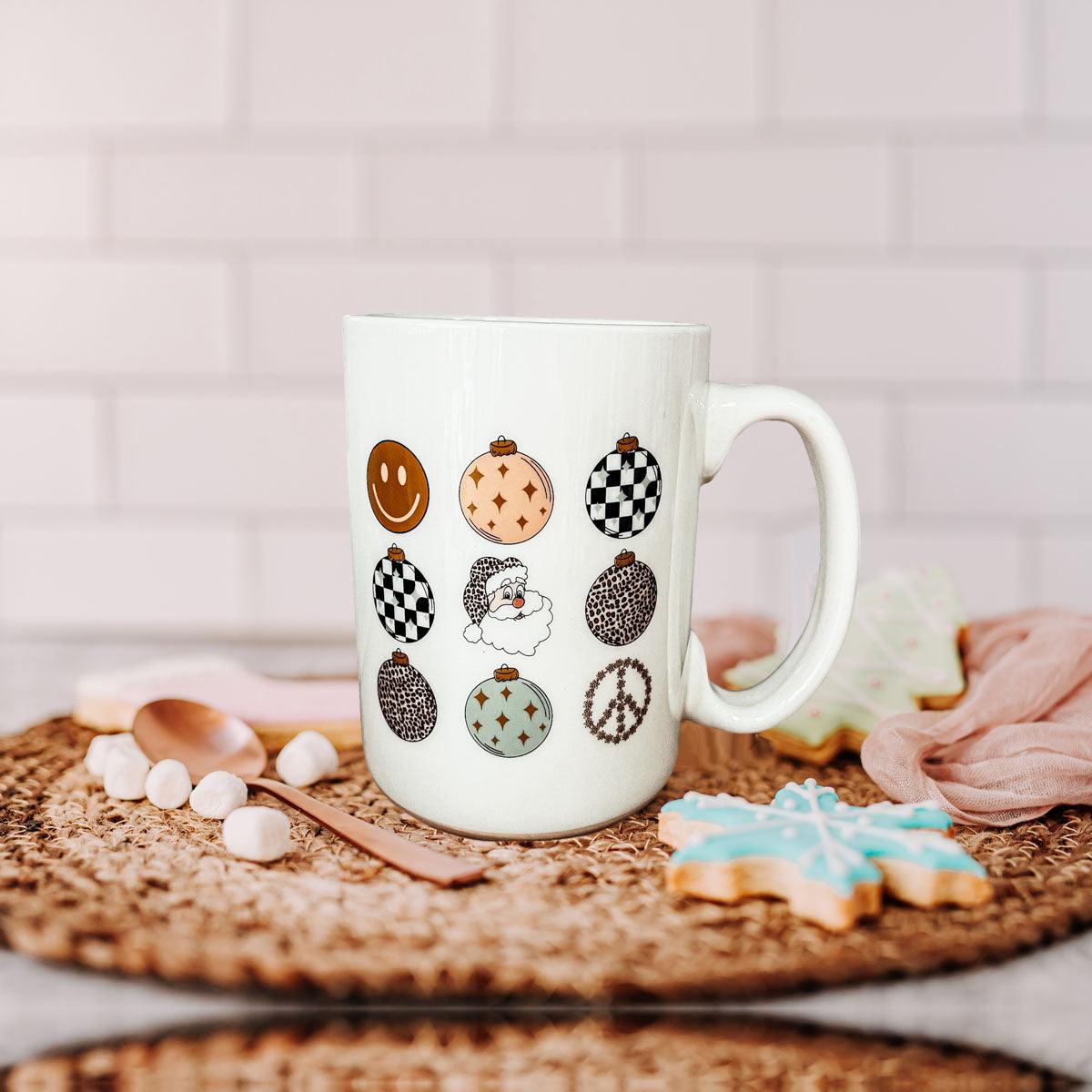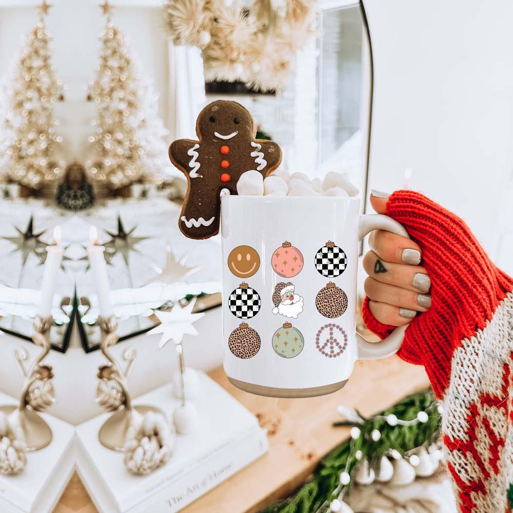 Get ready to add a touch of vintage charm to your holiday season with our Retro Style Christmas Ceramic Coffee Mug! Perfect for those who love a nostalgic twist on festive fun, this mug is adorned with nine delightful circle ornaments, each featuring a unique design like Santa, a smiley face, a peace sign, and more.