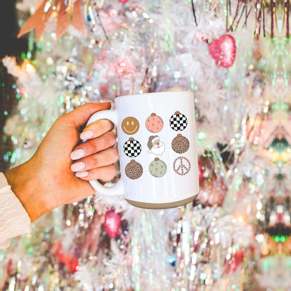 This double-sided mug captures the essence of a classic holiday celebration with a modern mom’s sense of humor. Both sides showcases the colorful ornaments in all their retro glory,.